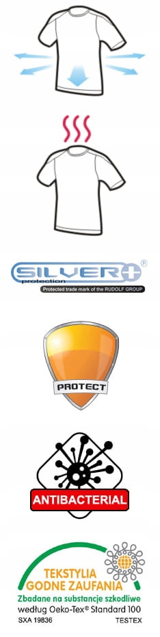Полиэфирные микроволокна + ионы серебра (бактериостатический фактор) предотвращают перемещение бактерий из материала. на кожу, сводя к минимуму риск возникновения аллергии и прекращая выделение неприятных запахов. Футболка сохраняет форму и внешний вид, а благодаря эластичности и растягиваемости используемых волокон обеспечивает большой комфорт при движении. Он очень хорошо прилегает к телу, приспосабливаясь к его анатомическим формам, и не теряет эластичности даже после длительного интенсивного ношения. Эстетичный внешний вид термоактивной одежды позволяет использовать ее как в качестве спортивного белья, так и в качестве повседневной одежды.
