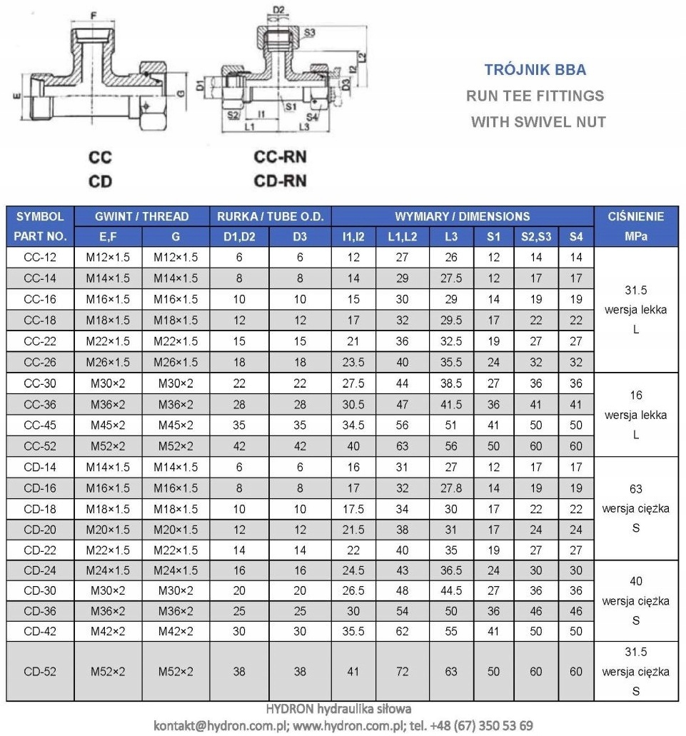 - Стандарт изготовления: Метрический DIN 2353 (PN -EN ISO 8434-1)