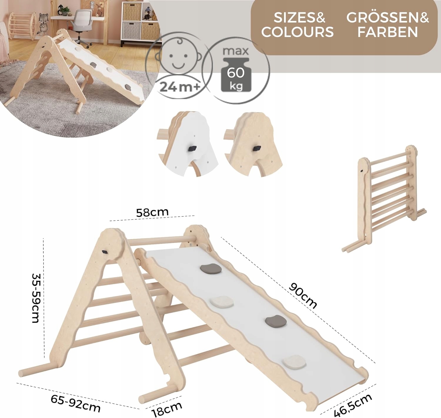 - ✔ Современный моторный треугольник впечатляет внешним видом из необработанного дерева. Светлый цвет выглядит легко и подойдет к любому интерьеру. Универсальный дизайн особенно подходит для помещений, оформленных в скандинавском стиле. Рядом с винтами расположены точно изготовленные детали. Лазливая пирамида с горкой отличается простой формой и естественной отделкой. Деревянная детская горка с одной стороны гладкая, а с другой имеет укрепляющие перекладины. Также с натуральным финишем.