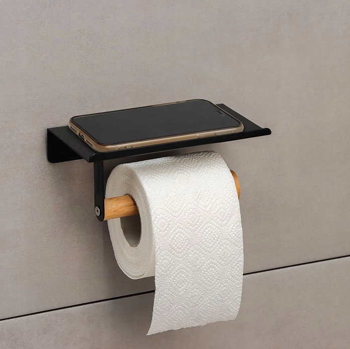 Держатель для туалетной бумаги изготовлен из высококачественной черной углеродистой стали и бамбукового дерева и идеально подходит для современной ванной комнаты.