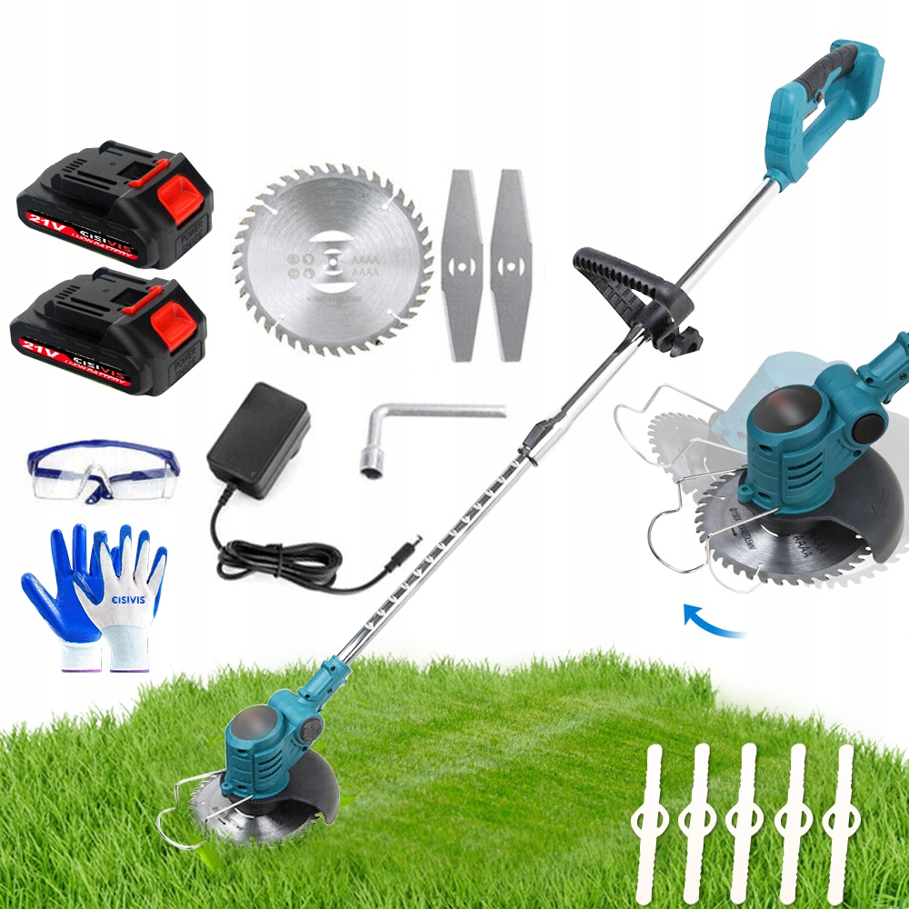 🌿, оборудованные 3 различными лезвиями: металл длиной для толстых сорняков и небольших кустарников, пластиковый длинный пластик для мягкой травы и металлические круглые для более толстых кустарников и ветвей.