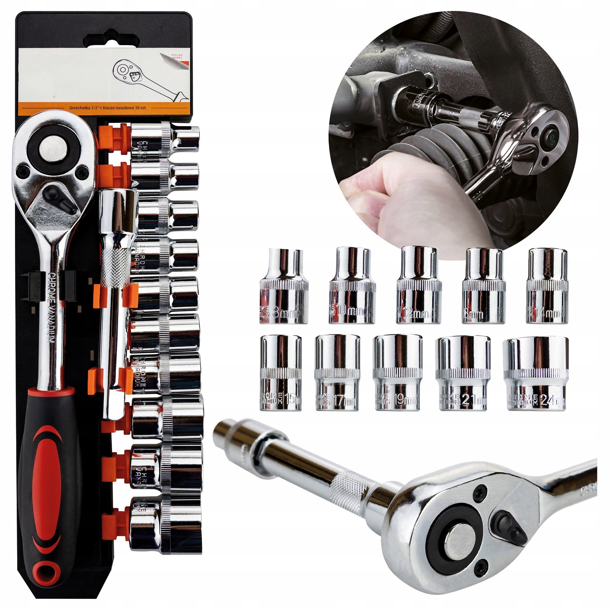 Рукоятка с храповым механизмом покрыта противоскользящим покрытием, что гарантирует надежный захват даже мокрыми или жирными руками. в комплект входит удлинитель длиной 12 см, благодаря которому можно закручивать шурупы в труднодоступных местах.Торцевые ключи имеют разные размеры: 8, 10, 12, 13, 14, 15, 17, 19, 21, 24 мм, который позволяет работать со многими типами гаек и болтов. Это делает набор идеальным для людей, которым нужны инструменты разных размеров и в то же время хотят сэкономить место в мастерской или автомобиле.