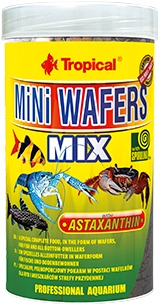 Мини -пластины смешали вафли с астаксантином и спирулиной для нижней рыбы и ракообразных. Многокомпонентная пища в виде небольших, тонущих пластин, красными и зелеными, предназначенными для ежедневного кормления всеядных рыб, кормления в нижней зоне, например Красные пластины являются источником естественного астаксантина и бета-глюкана-сильный иммуностимулятор, который повышает устойчивость рыбы к болезням. Зеленые пластины содержат спирулину и волокно, которые регулируют пищеварение. Вафеля характеризуются высокими гидростабильными - впитывающими воду, они сохраняют свою структуру и не разваливаются, что облегчает кормление ракообразных и обеспечивает естественное кормление рыбы, чья мундштук превращается в всасывающую чашку, оборудованную зубами, используется для истирания пищи из твердых поверхностей.