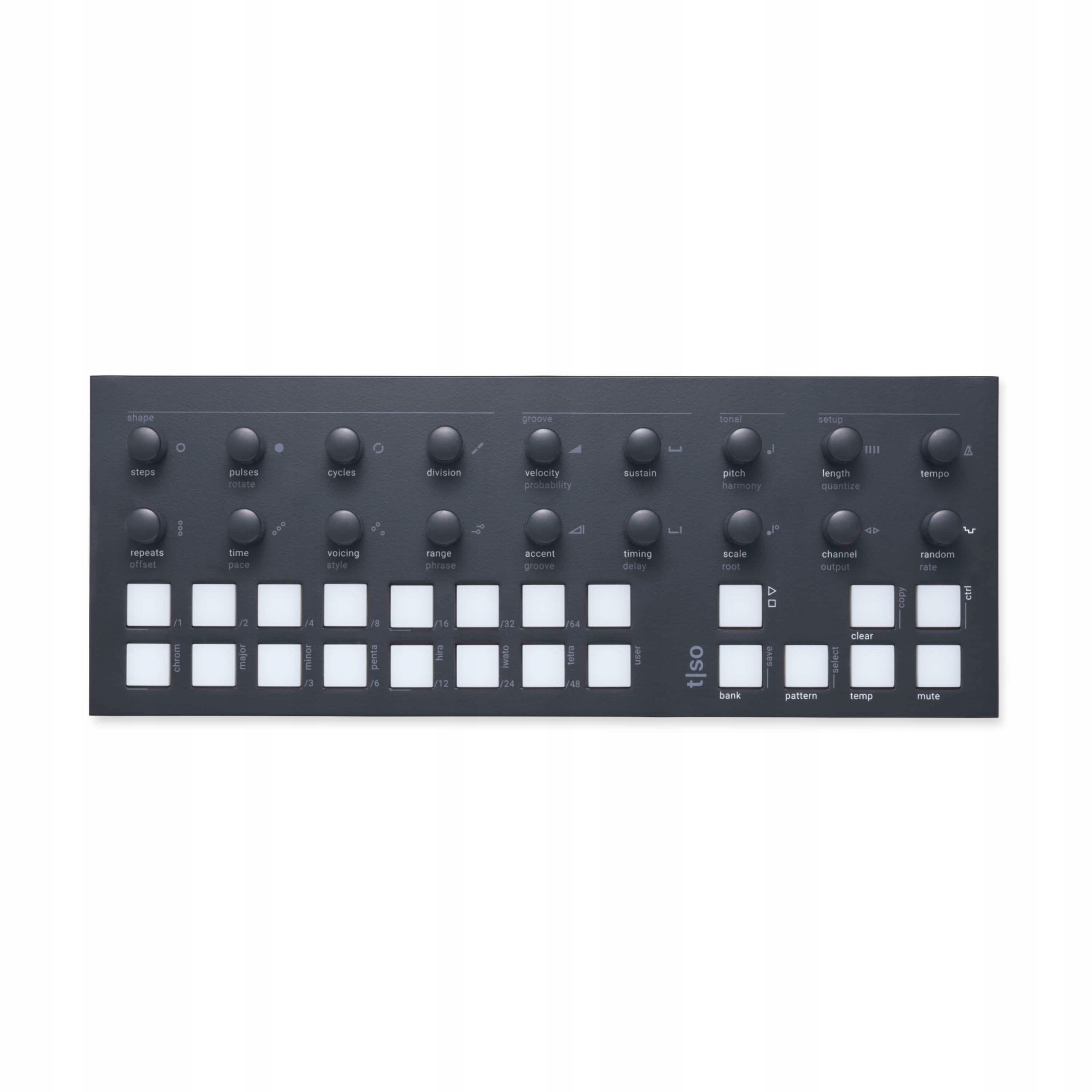 Torso Electronics T-1 является выразительным алгоритмическим секвенсором. Он имеет генератор euclide -rhythm с пошаговым изданием, повторение ореховых/арпеджиаторов, генератор мелодии, 7 музыкальных шкал + 1 шкала пользователя на путь, управление высотой гармоникой, случайная модуляция каждого параметра, 16 банков с 16 банками, USB C (MIDI/Power Fulter), входной/вывод/Midi Out Gate, Ableton Link (WIFI). Вдохновленный легендарными игровыми автоматами и последовальными барабанными игроками с 1980 -х и 1990 -х годов.