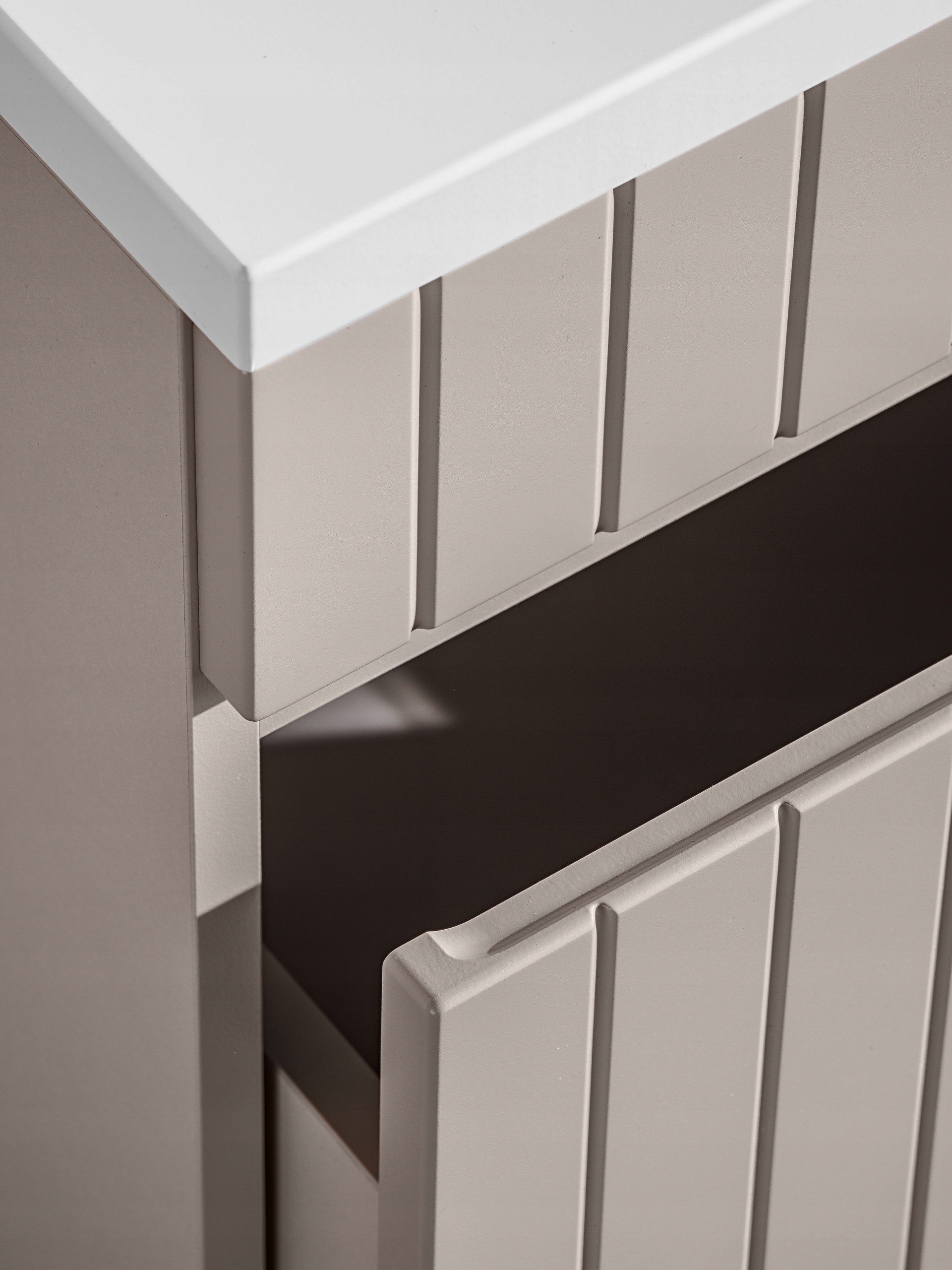 Коллекция ICONIC CASHMERE — это уникальный дизайн, отличающийся использованием вертикального фрезерования > как на фасадах, так и на корпусах мебели. Рифленый эффект привносит необыкновенное движение и плавность в интерьер ванной комнаты, создавая неповторимую эстетику.