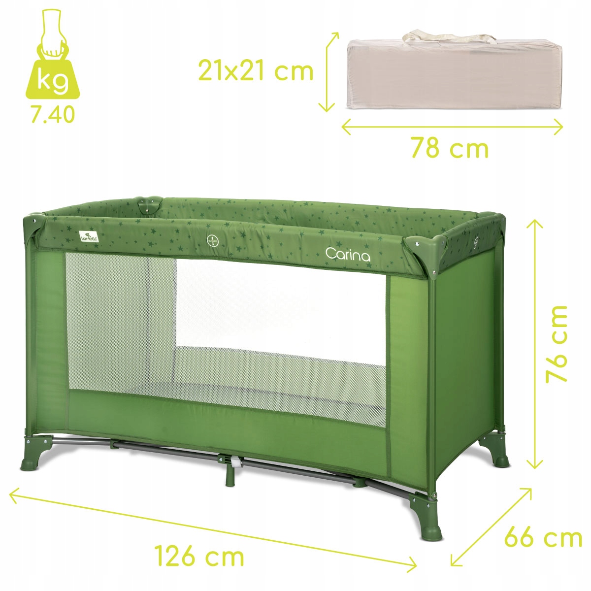 Lorelli Carina 1 - это практическая туристическая кровать , которая, благодаря компактному складке, оснащению (, матрасам и транспортной сумке ) становится незаменимым во время путешествия, с бабушкой и дедушкой, на сюжете или дома.
