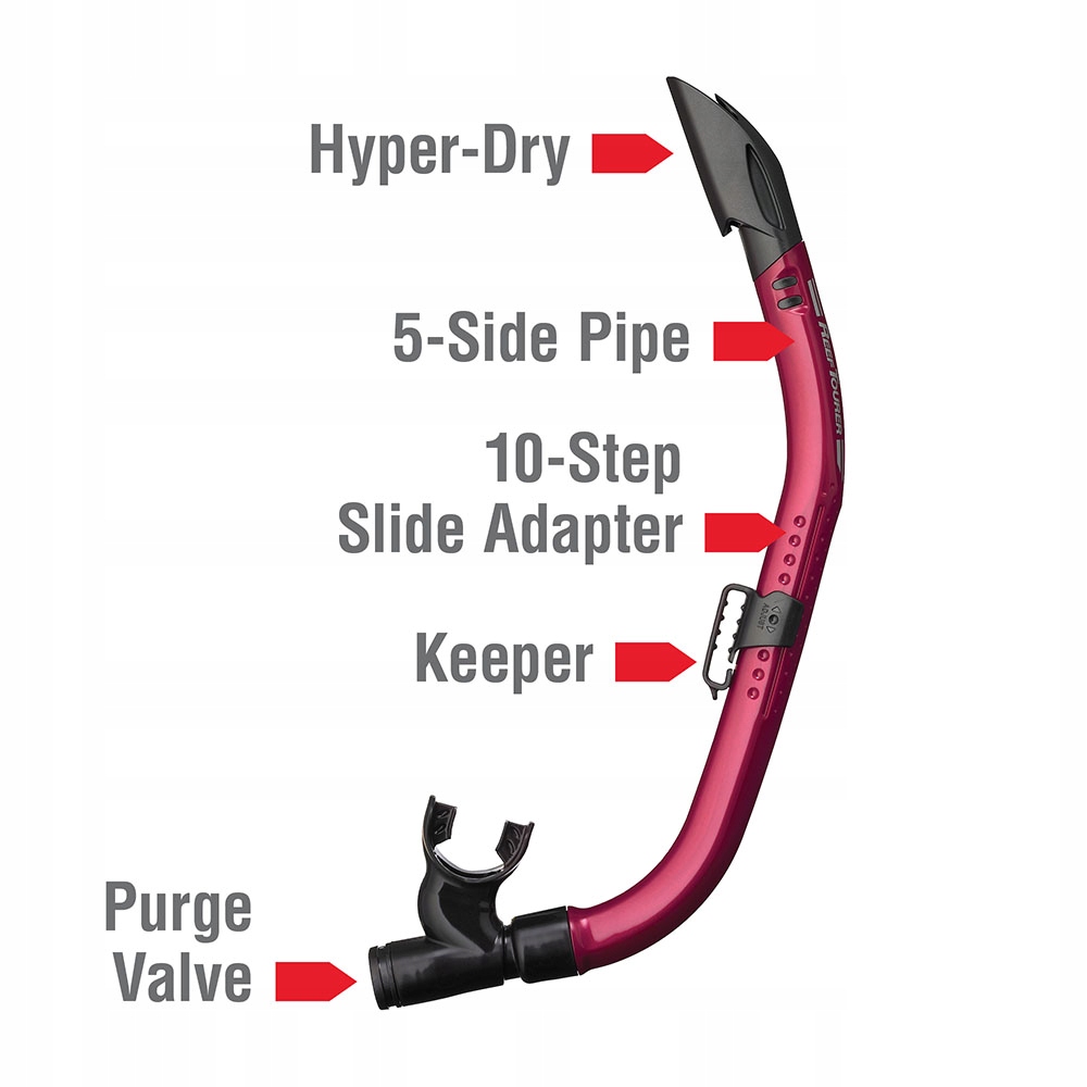 TUSA HYPERDRY с гипоаллергенным силиконовым мундштуком, обеспечивающим удобство использования, и верхним защитным клапаном от волн, заливающих трубку водой - HYPERDRY.