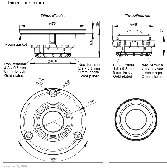 TW022WA09 — это высококлассный высокочастотный динамик, предназначенный для самых требовательных приложений и оснащенный множеством деталей, улучшающих характеристики, которые способствуют достижению низкой резонансной частоты, низкого уровня искажений и очень высокого частотного расширения.