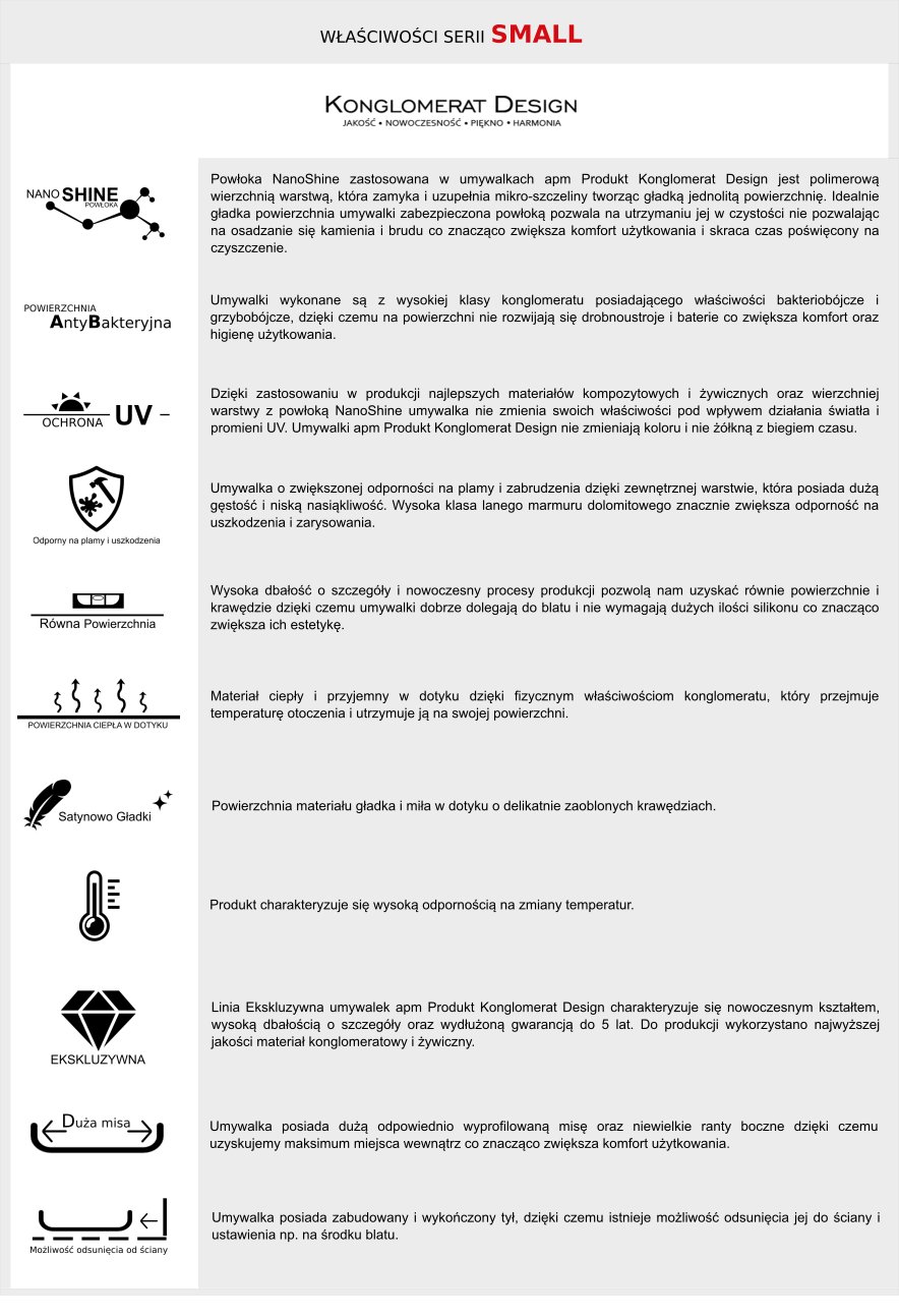 При производстве эксклюзивной линии умывальников APM Product Konglomerat Design использовались конгломерат и смолы высочайшего качества. Раковины очень прочны и устойчивы к царапинам, что делает их идеальными для повседневного использования. Умывальники предназначены для установки на столешницу или шкаф в заранее подготовленное отверстие. Умывальник имеет встроенный глянцевый хромированный перелив, расположенный посередине задней стенки чаши. Отверстие под смеситель диаметром 3,5 см и сифон 4,5 см, стандартизированные для соответствия 99% сифонов и кранов, доступных на польском рынке.