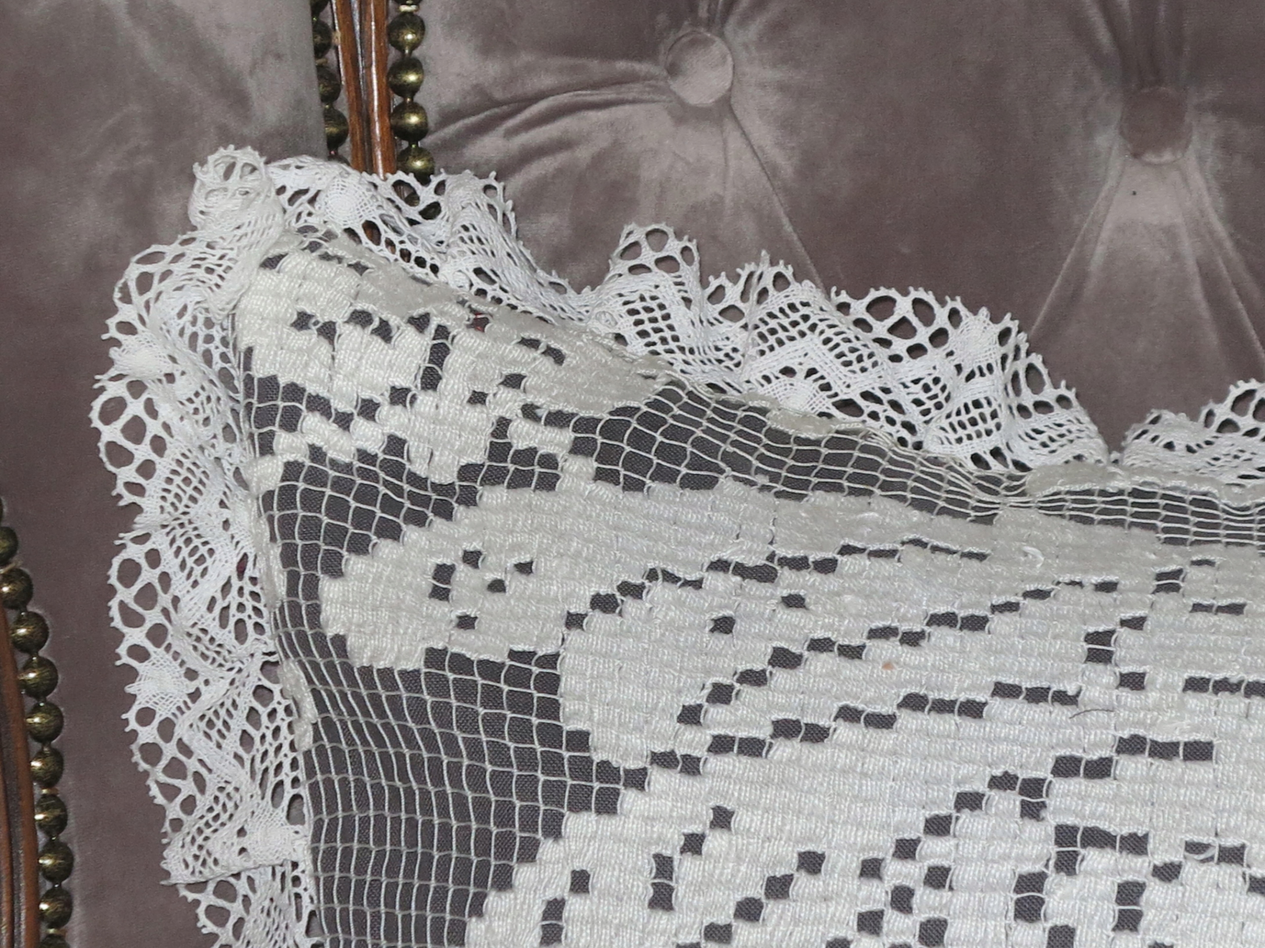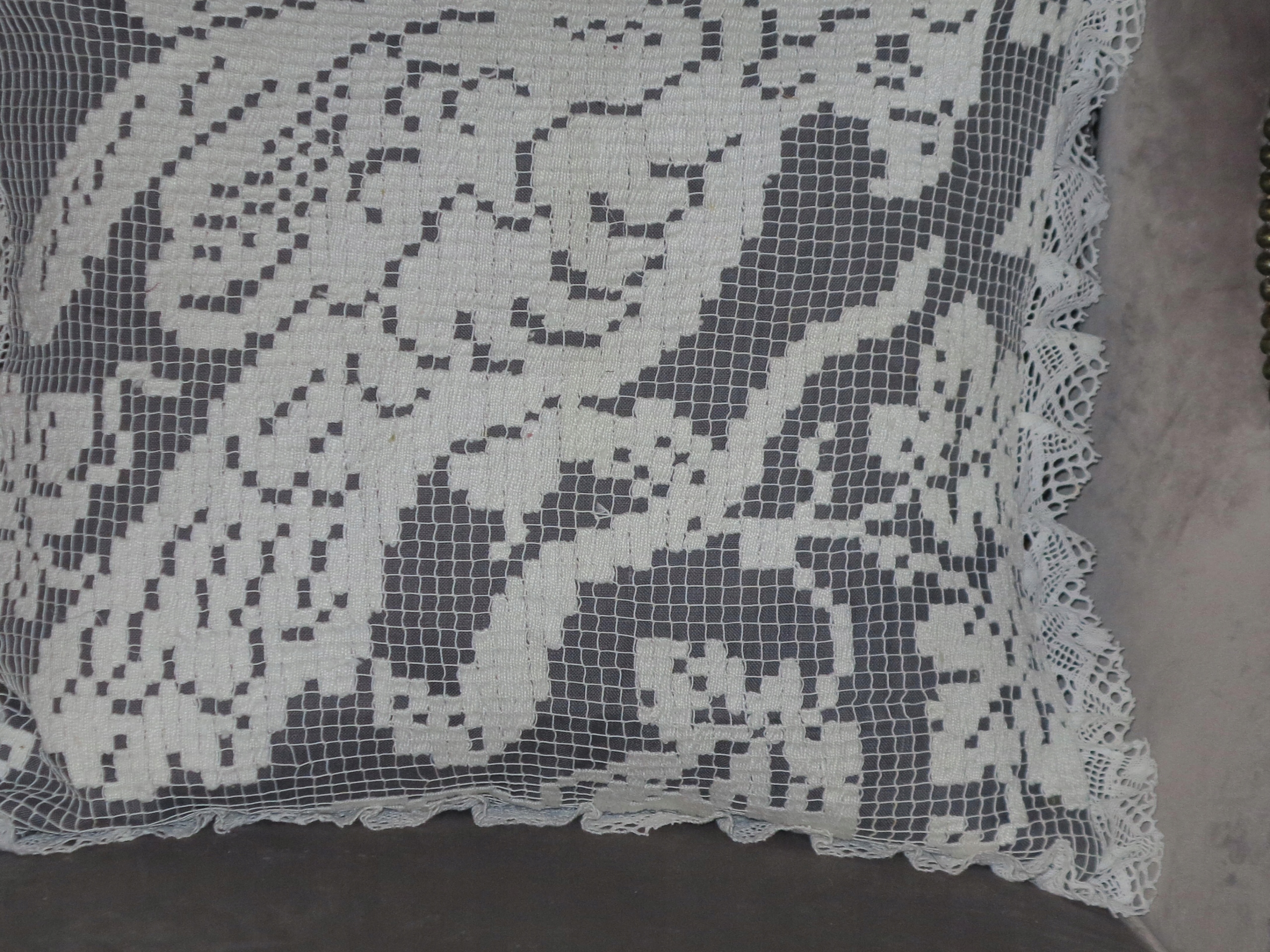 ОБРАЗЕЦ - ЧРЕЗВЫЧАЙНО КРАСИВЫЙ И ЧРЕЗВЫЧАЙНО ДЕКОРАТИВНЫЙ ВРЕМЯ/ БОЛЬШАЯ ЛЬНЯНАЯ ПОДУШКА, ПЕРЕДНЯЯ ПОДУШКА, УКРАШЕННАЯ БУЛАВКОЙ С КРАСИВЫМ ОРЛОМ, СИДЯЩИМ НА ВЕТКЕ. ХЛОПКОВОЕ КРУЖЕВО ВОКРУГ. БЕЛЬЕ ТЕМНО-ПЕПЕЛЬНОГО ЦВЕТА. КОЛЬЦО И КРУЖЕВО БЕЛОГО ЦВЕТА
