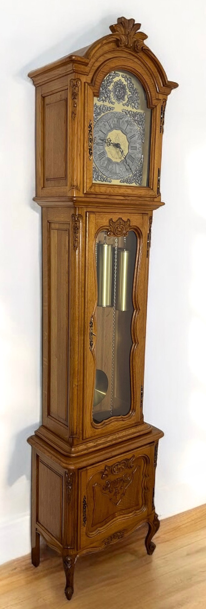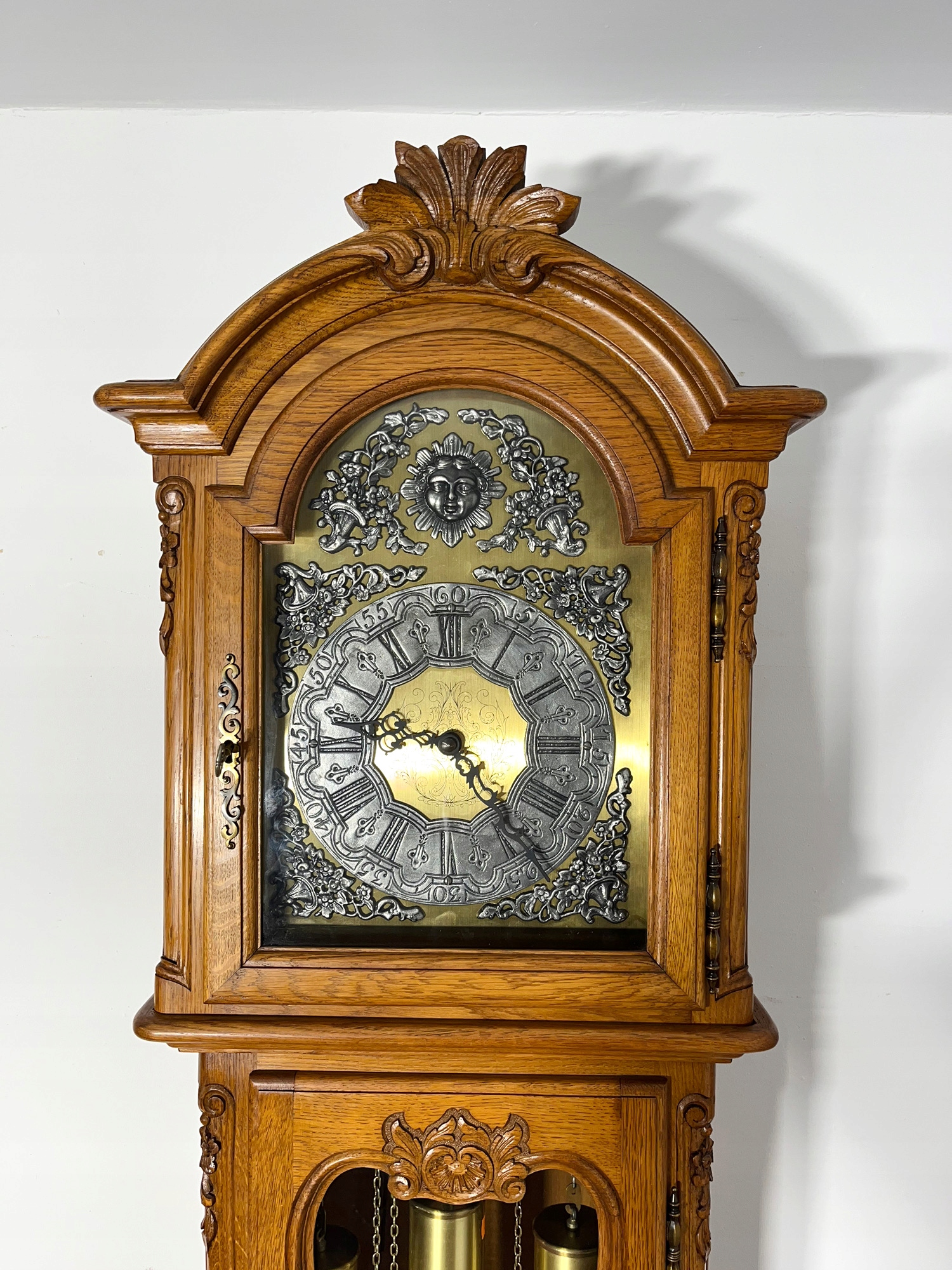 Часы были отремонтированы в нашей мастерской, исправлена покраска и очищены детали. Механизм часов отрегулирован, поскольку он прошел профессиональную проверку у часовщика. Часы имеют три шкалы, перезвон, мелодичный, нежный звук, есть переключатель звука.