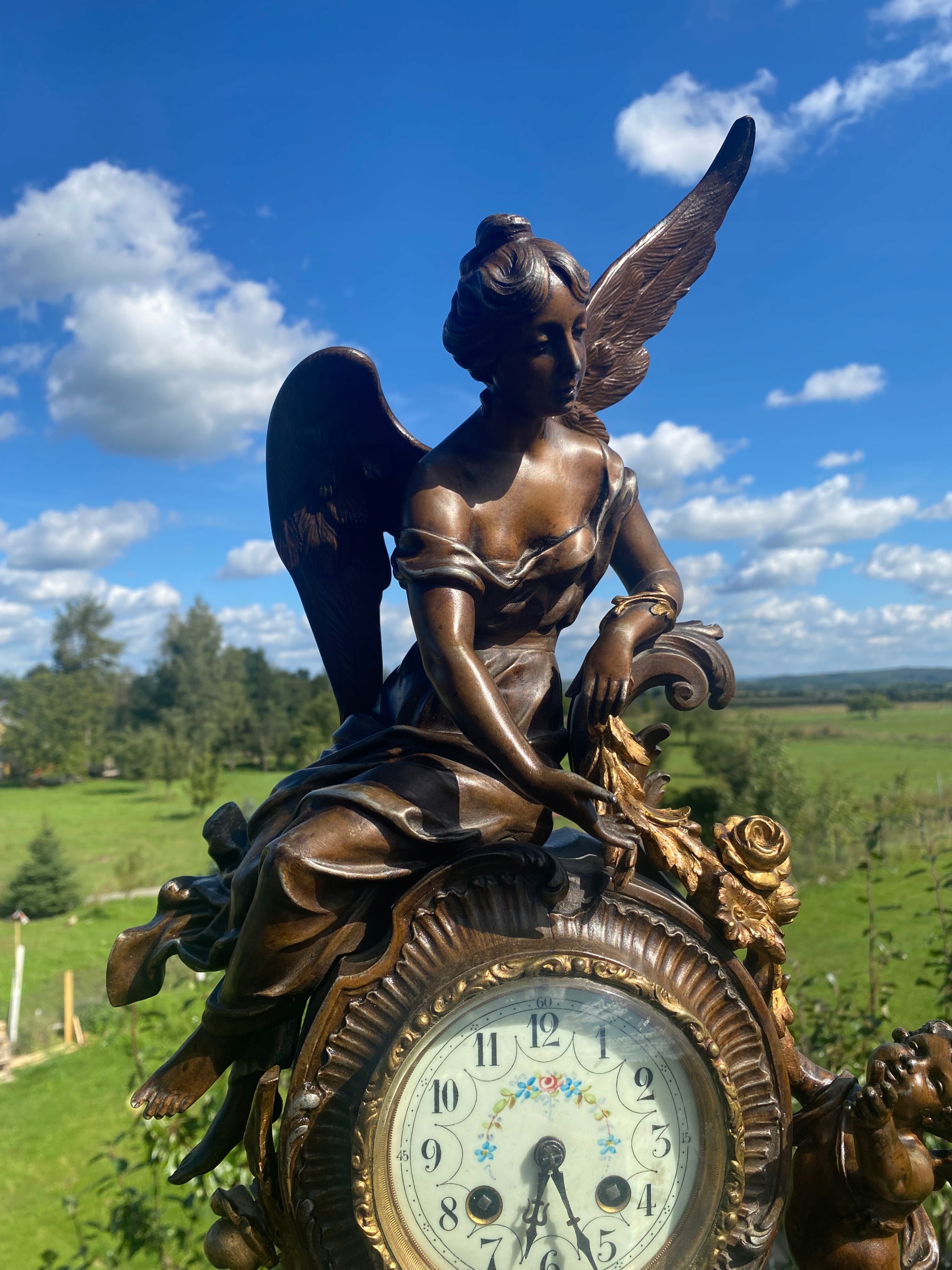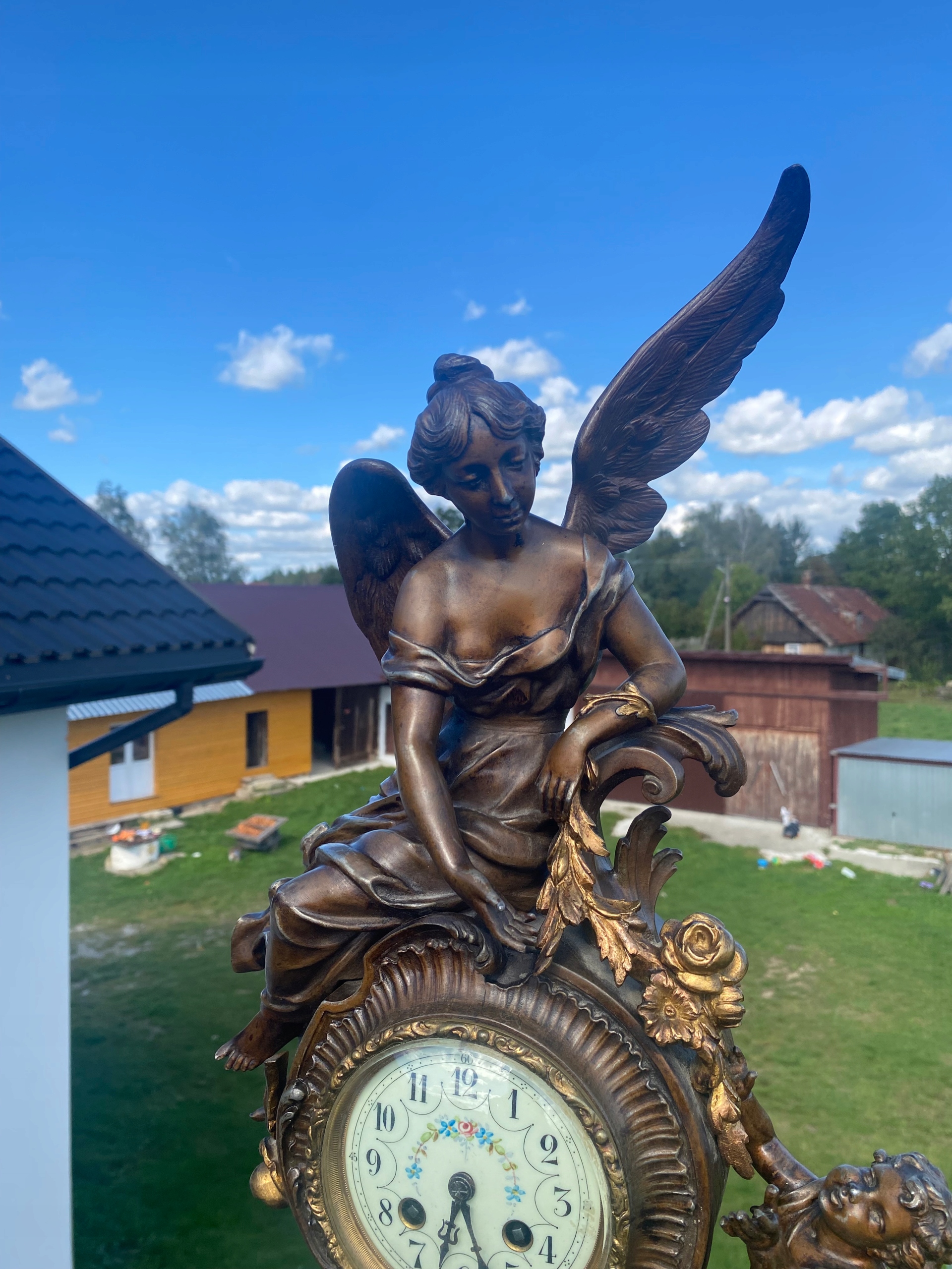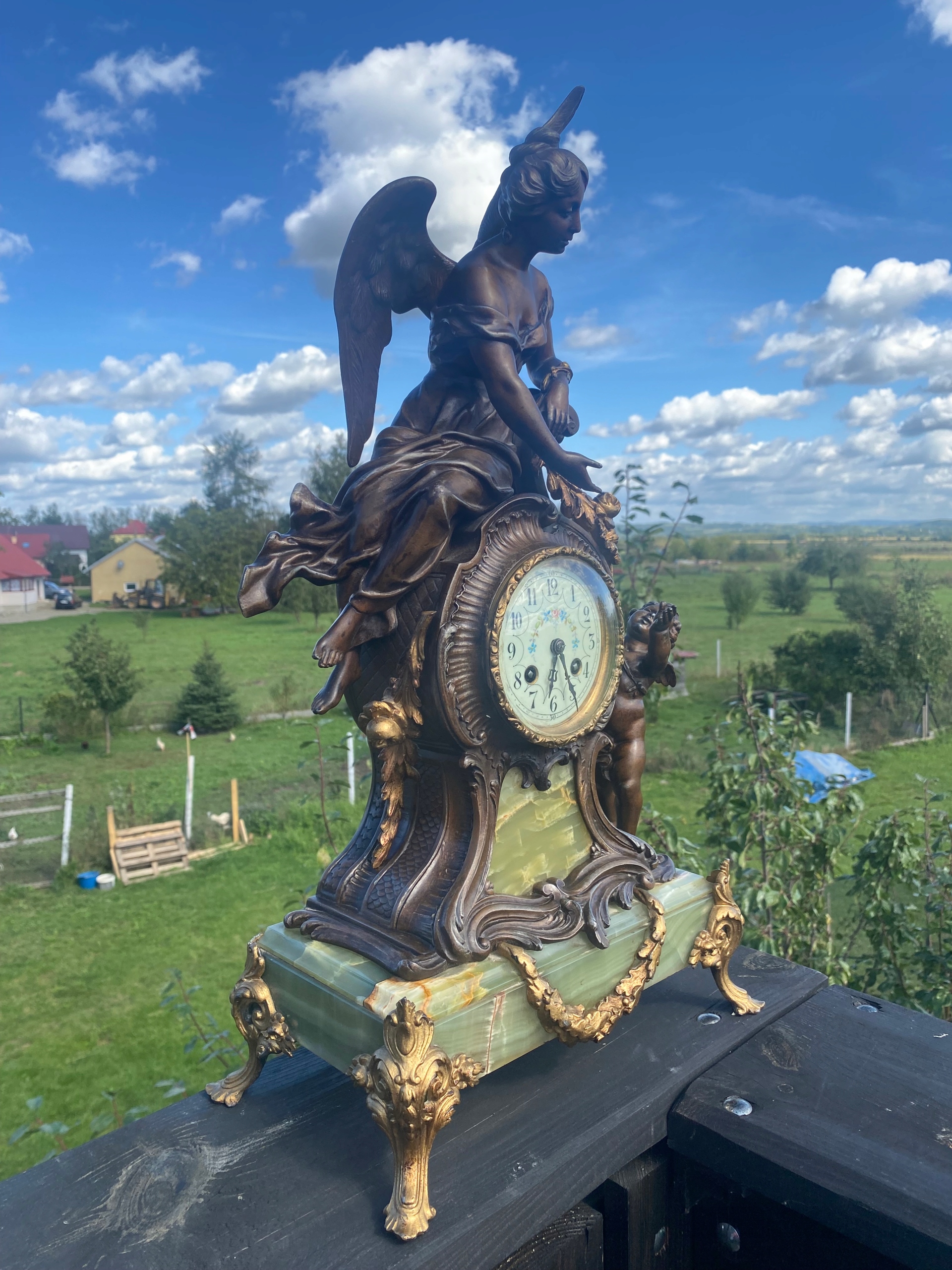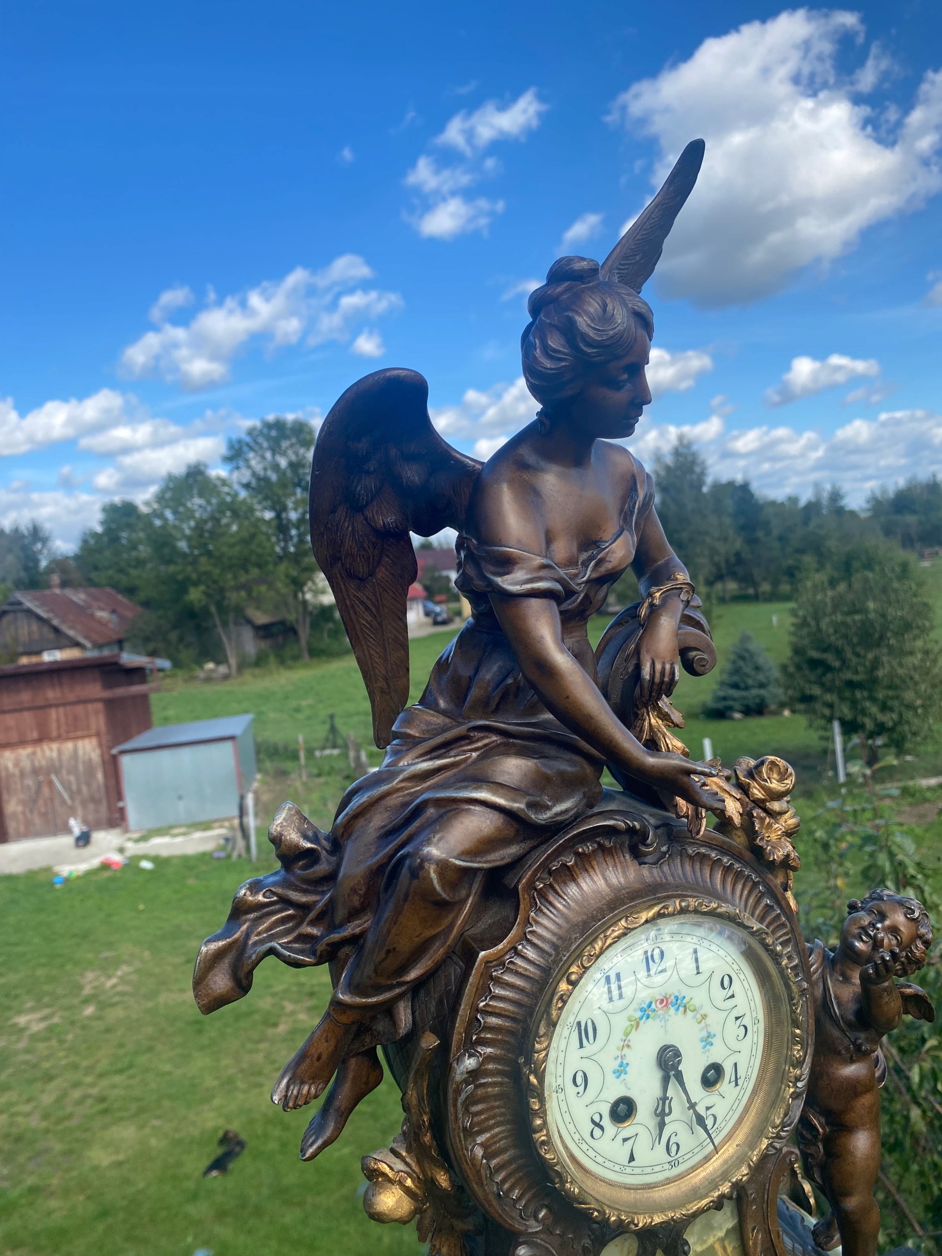 Я продаю очень красивые каминные часы, изображающие большую Анжелис, сидящую на механизме, и подают маленькую ангелу Лиану из листьев и цветов, очень хороший мотив часов.