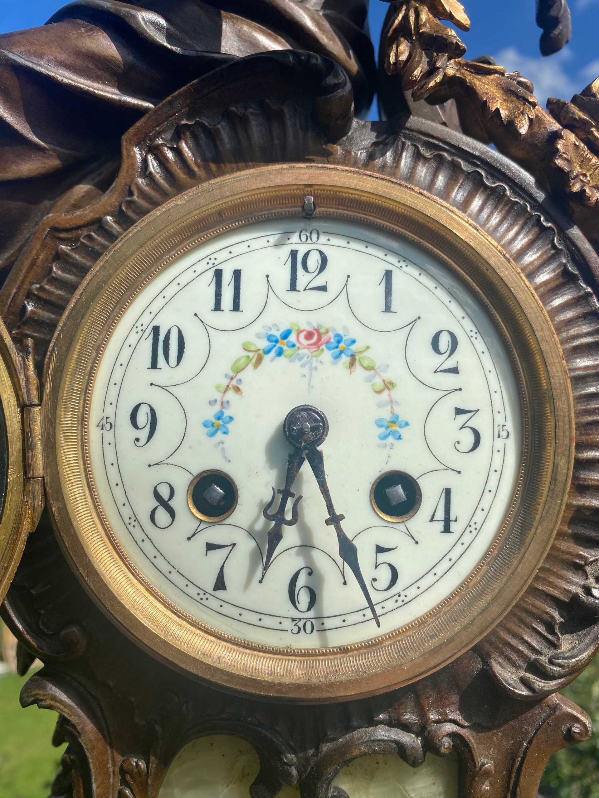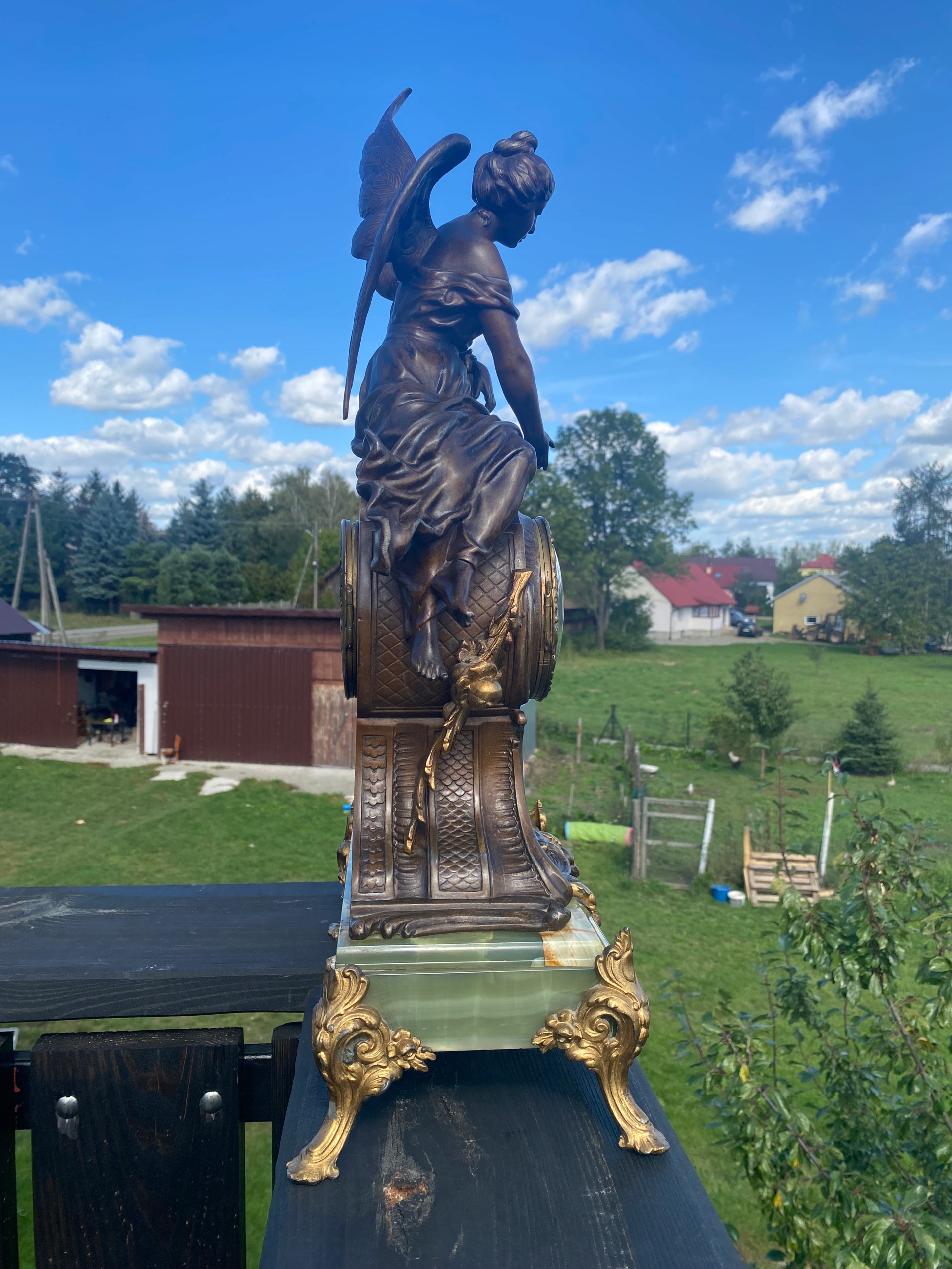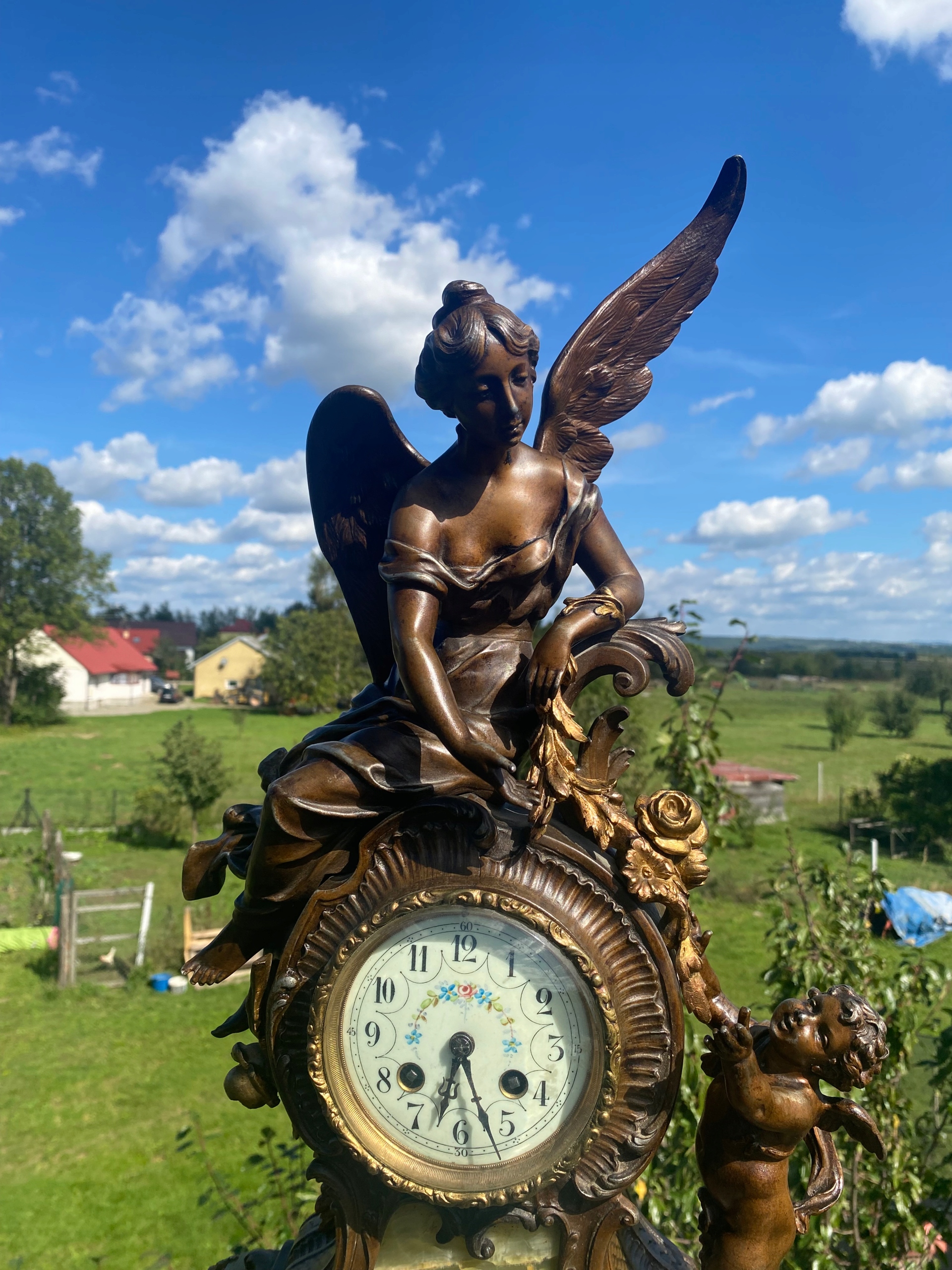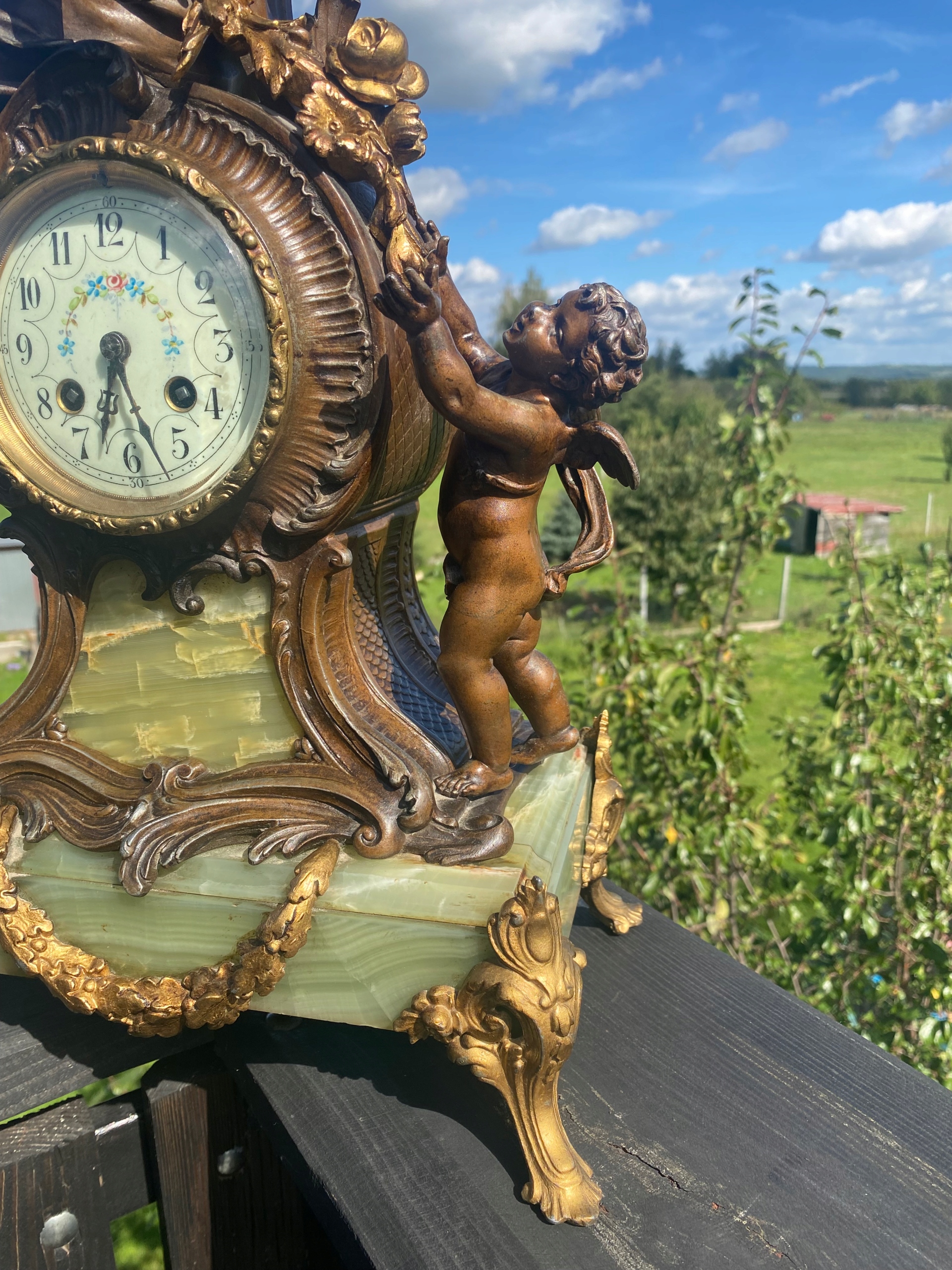 Я продаю очень красивые каминные часы, изображающие большую Анжелис, сидящую на механизме, и подают маленькую ангелу Лиану из листьев и цветов, очень хороший мотив часов.