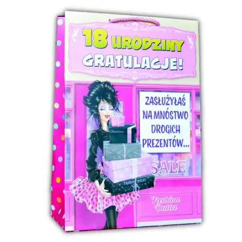 Элегантный подарочный пакет с забавной надписью в честь 18-летия. Пакет изготовлен из плотной лакированной бумаги.
