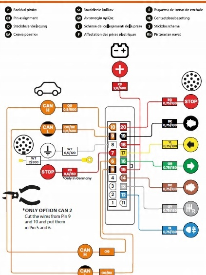 Можно сказать, что модуль T-CAN RS представляет собой в каком-то смысле универсальную электроустановку, которая, после программирования используется термин специализированный ремень безопасности, поскольку после программированияподходит исоединяется с конкретным транспортным средством. В некоторых автомобилях связь двусторонняя в виде сигнализации перегоревшей лампочки на приборной панели или отключения PDC после подключения соответствующего приемника (например, прицепа или велосипедной стойки) к электрической розетке фаркопа. жгут, который можно найти только в специальных жгутах.