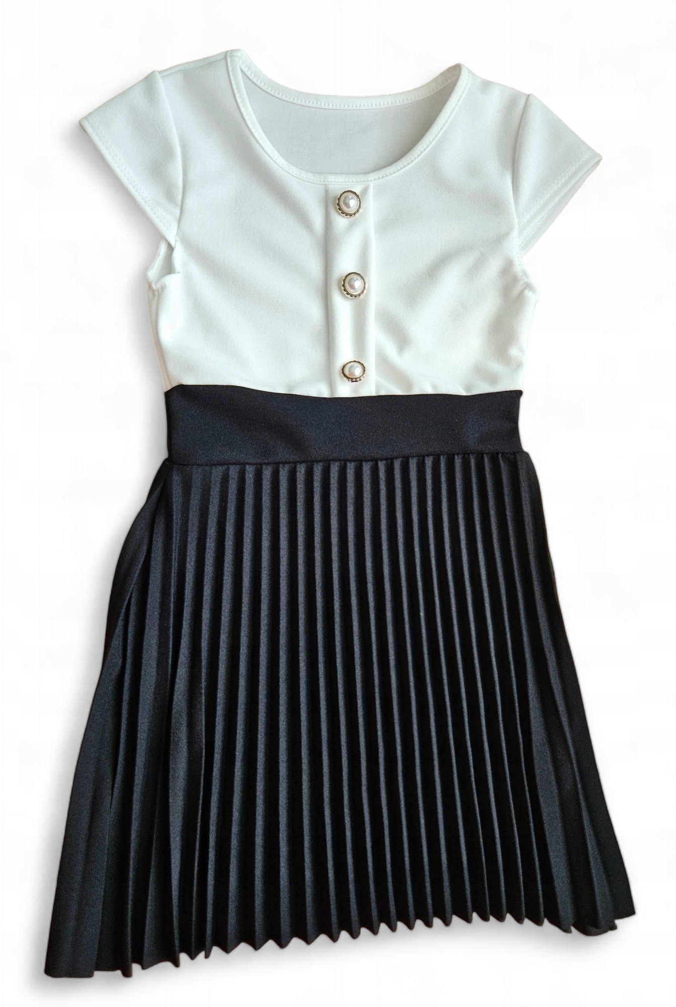 Низ платья черный со складками, верх белый с декоративными пуговицами.