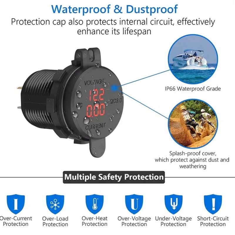 Wolmtomierz и амперметр с быстрым USB -гнездом. Легко установить, будет прекрасно работать на лодке. Красная светодиодная подсветка. Переключающий луч с предохранителем включена. Аммеметр измеряет энергопотребление от USB.
