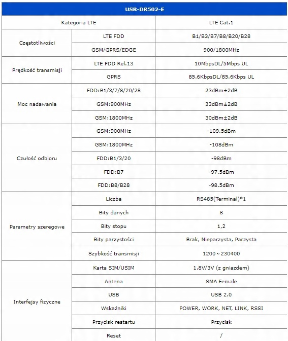 Модем поддерживает основные диапазоны частот европейских операторов. USR-DR502-E имеет расширенные функции программного обеспечения, включая прозрачную передачу TCP/UDP, передачу SMS, клиентский режим HTTPD и настройку с помощью AT-команд. Он прост в настройке, отличается высокой надежностью, имеет встроенный аппаратный сторожевой таймер и поддерживает обновления FOTA. Промышленный модем USR-DR502-E на DIN-рейке оснащен клеммами питания с широким диапазоном напряжения, что упрощает его использование.