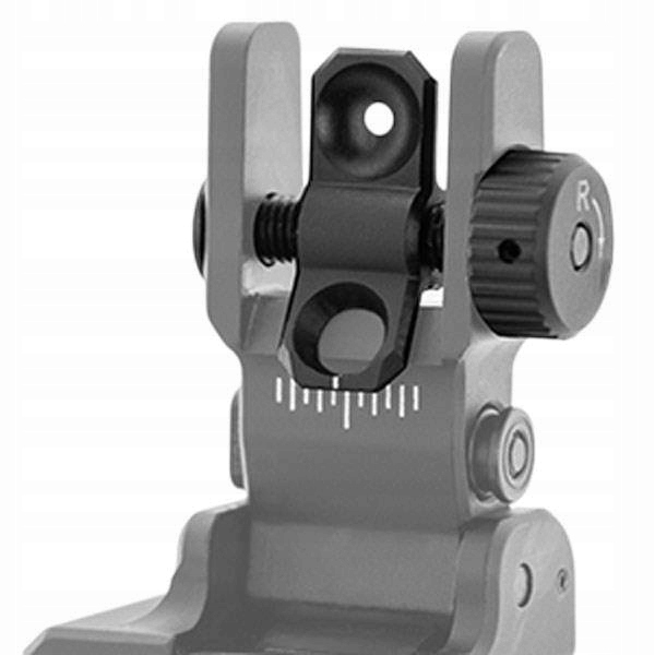 Он крепится на планку Пикатинни с помощью прямоугольного стального винта. Он имеет замок для предотвращения случайного складывания и регулируется с помощью ручки. Целик служит запасным, установлен под углом 45 градусов.
