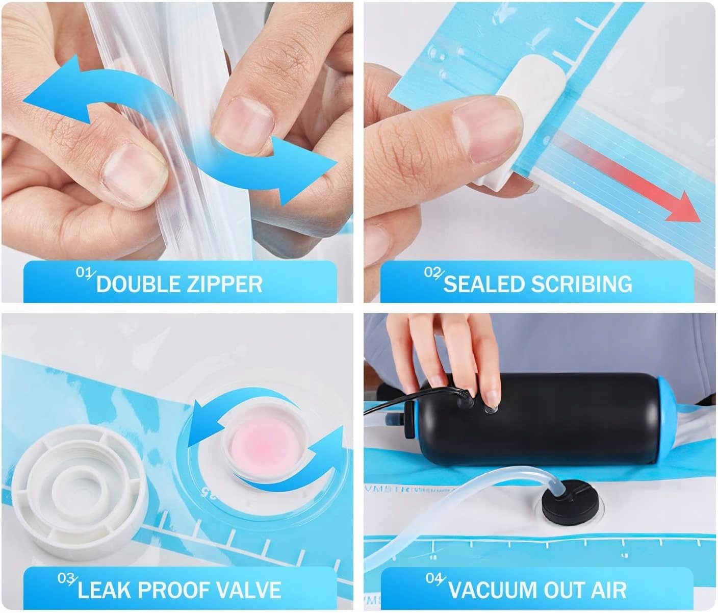 мешки могут использоваться много раз, изготовлены из прочных материалов PE + PET и оснащены двойными молниями, которые обеспечивают затянутость и экономят пространство до 80%.