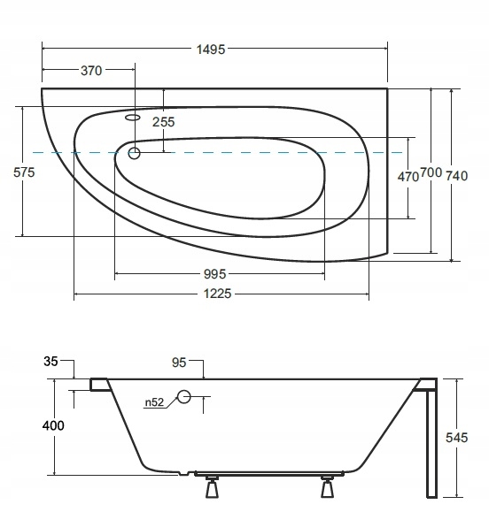 ВАННА ДЛЯ МАЛЕНЬКОЙ ВАННОЙ 150 х 70 МИЛЕНА ПРАВАЯ, черный корпус и сифон