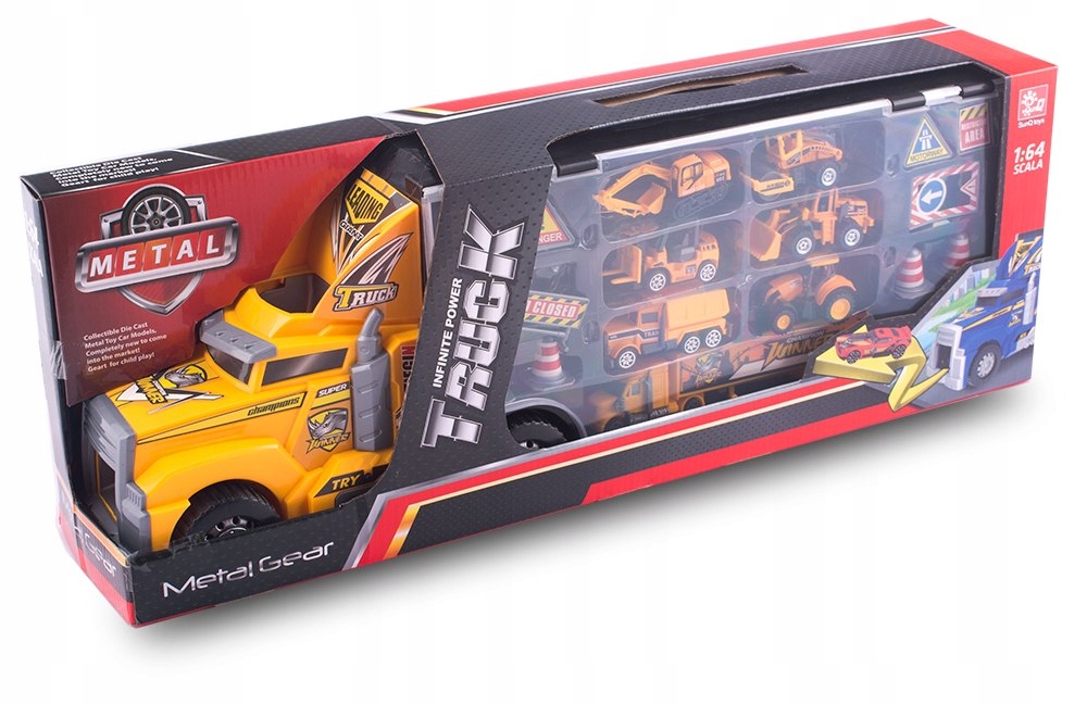 Игрушка состоит из большого грузовика с полуслушением, в котором мы найдем до 7 автомобилей. Это различные типы строительных транспортных средств и один трактор с полусроком. Грузовик имеет открывающиеся закрылки по бокам по обе стороны автомобиля. Внутри есть 7 отсеков с обеих сторон, служащих в качестве кладовой/гаражей для всей коллекции небольших автомобилей.
