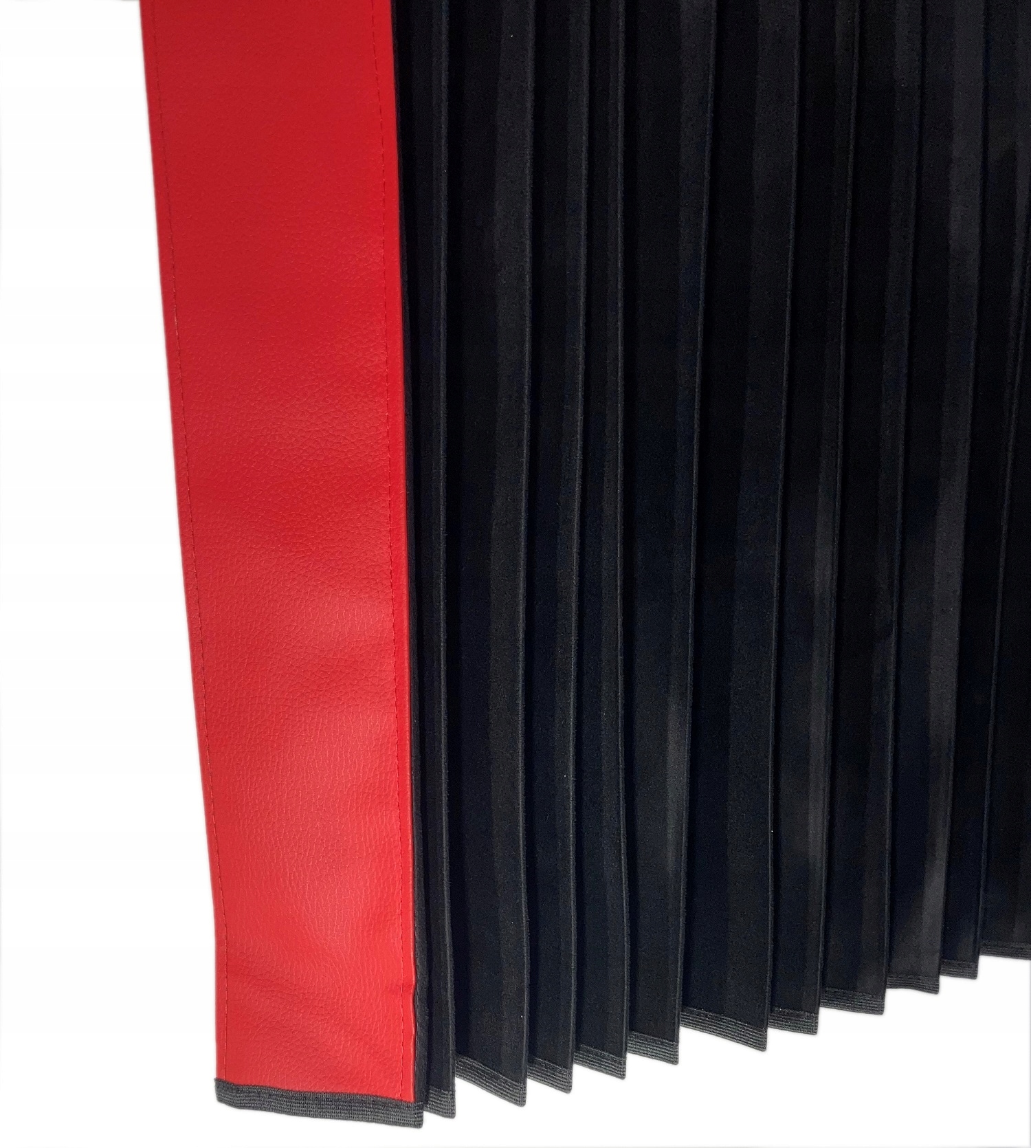ПЕРЕДНЯЯ ЧАСТЬ ШТОР - КРАЙ ОТДЕЛЕН КОЖАНЫМ МАТЕРИАЛОМ, ЧТО ДЕЛАЕТ ВСЮ КОНСТРУКЦИЮ ЖЕСТКОЙ И ОБЛЕГЧАЕТ СКЛАДЫВАНИЕ В НОЧЬЮ