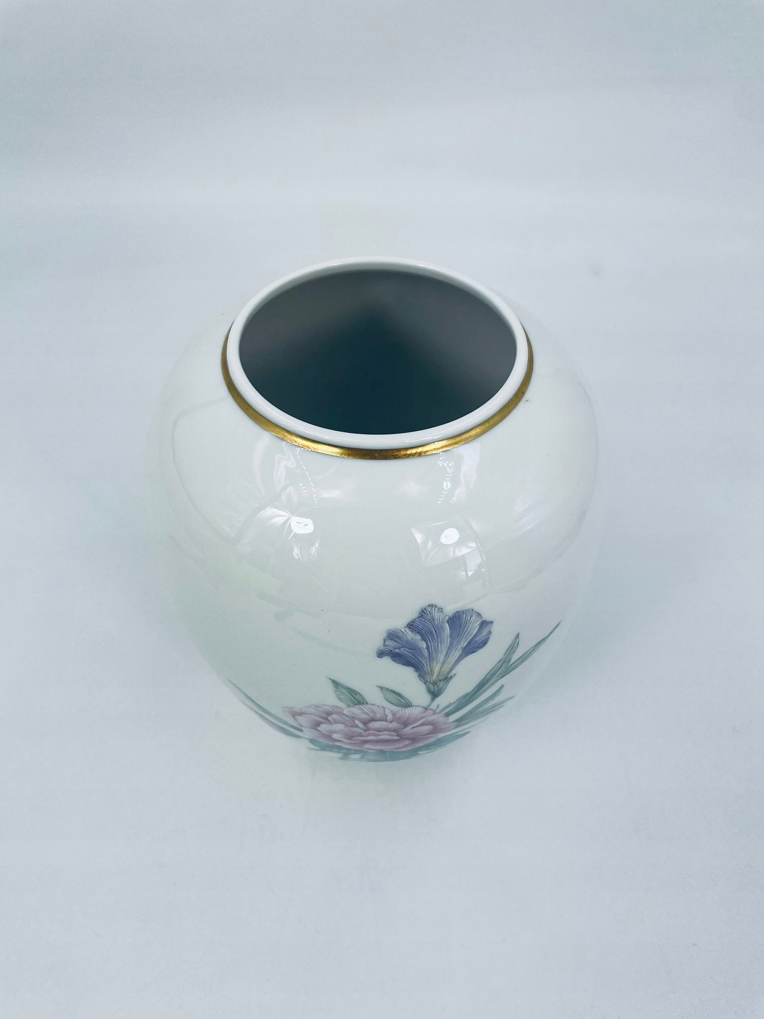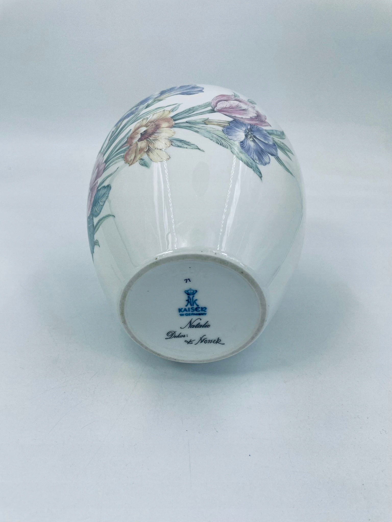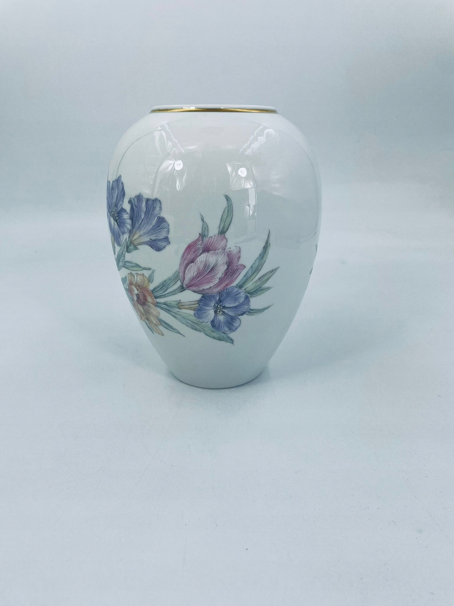 vase keizer Германия Натали из 70-80-х годов. Ваза, сделанная из высококачественного белого фарфора с тонким цветочным мотивом, отделана позолочкой на верхнем ободе.