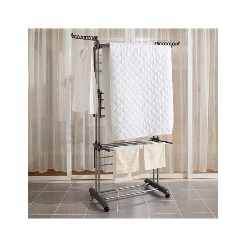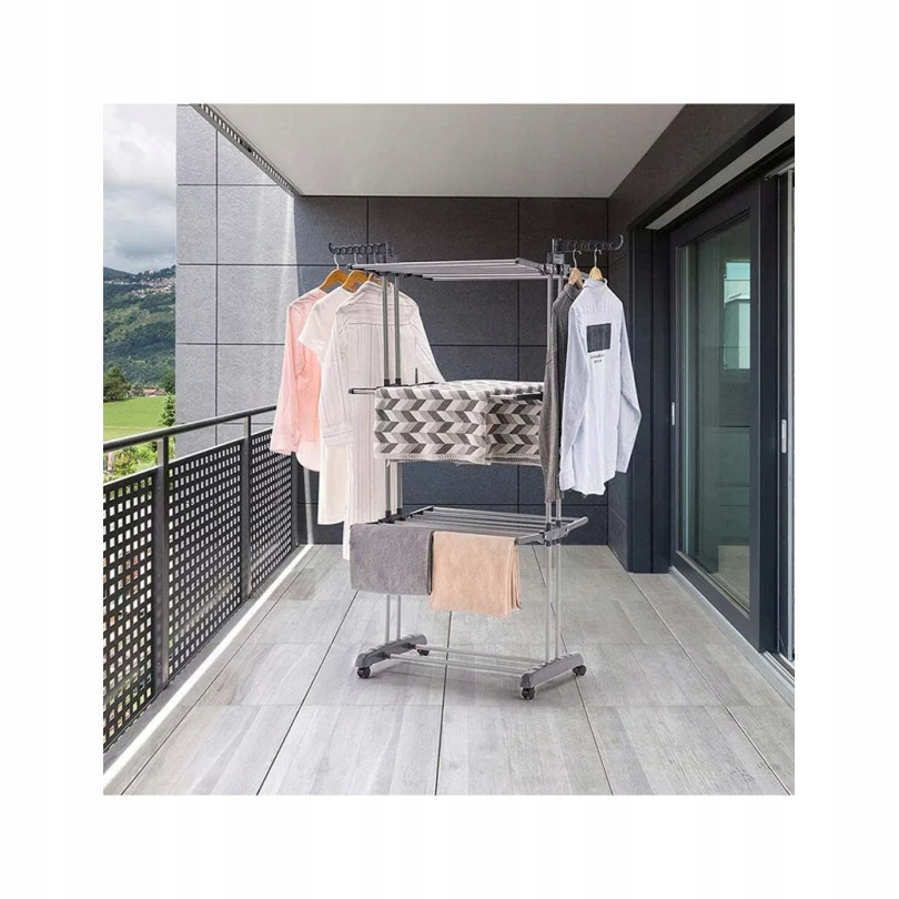 Сушилка оснащена колесами для облегчения перемещения. Общий вес одежды, которую можно повесить, составляет до 51 килограмма. Это позволит вам развешивать несколько вещей одновременно, не беспокоясь о нехватке места для их сушки. Сушилку со всем бельем можно легко транспортировать без каких-либо усилий.