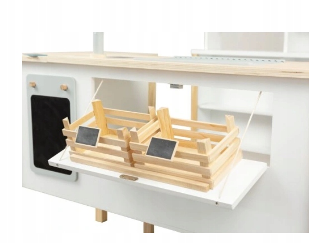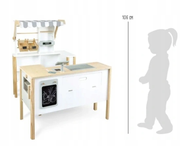 Деревянный магазин для детей и 2IN1 кухня, многофункциональная Fresh Smal Foot -это идеальный набор аксессуаров, которые предоставляют своим владельцам бесчисленных возможностей в рамках его использования. Компоненты могут быть установлены свободно, организуя пространство для адаптации целого к идеям малышей и индивидуальных потребностей. Набор содержит многофункциональный счетчик, наличные деньги с считывателем и настольным компьютером, раковина, оснащенная краном, грилем, индукционной плитой, духовкой, холодильником, кофемашиной, мелом и 2 корзинами с табличкой. Большое количество места означает, что многие дети могут принять участие в нем одновременно. В целом допускает всю историю реализма, повышает творчество самых молодых, дает возможность практиковать социальные навыки и подражать взрослым и учиться ежедневным обязанностям.