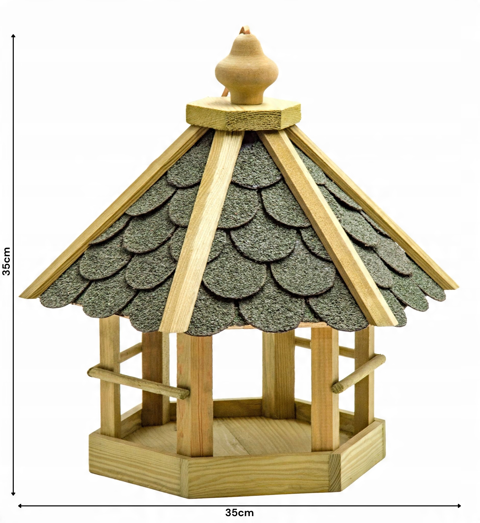 Кормушка оснащена прочной крышей. покрытая толем, которая не только добавляет элегантности, но и эффективно защищает кормящихся птиц от дождя и сохраняет корм в идеальном состоянии.