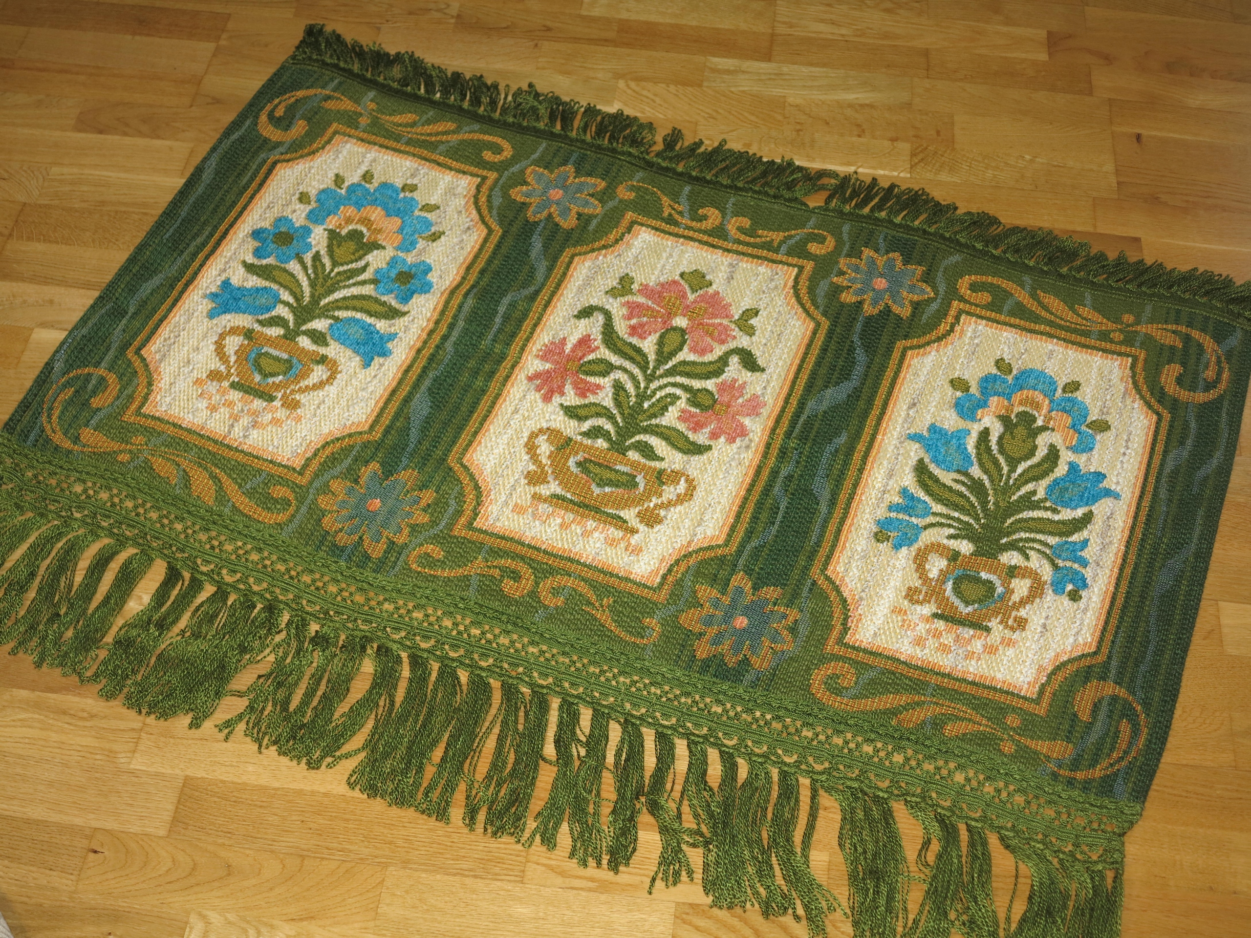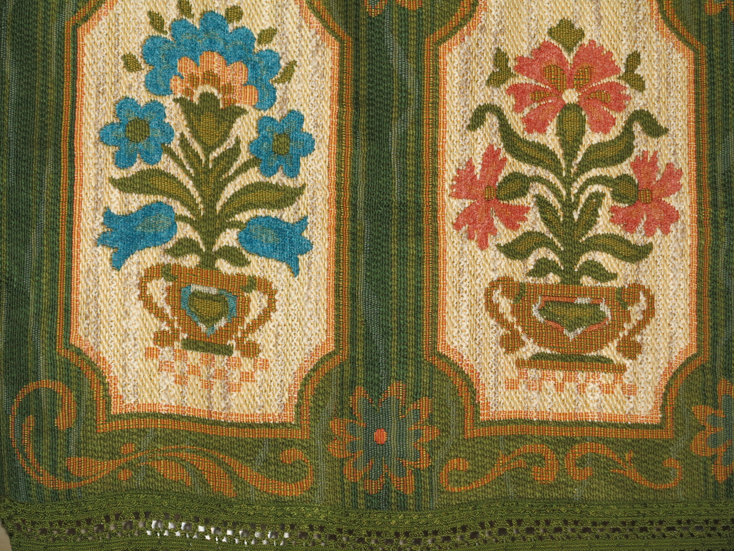 Возраст, красивая, большая, народная стена в стильном зеленых. Широкое кружево с длинной 15 -сантиметровой бахромой. На вершине вся ширина крепления крепления, так что его также можно прокинуть через стержень
