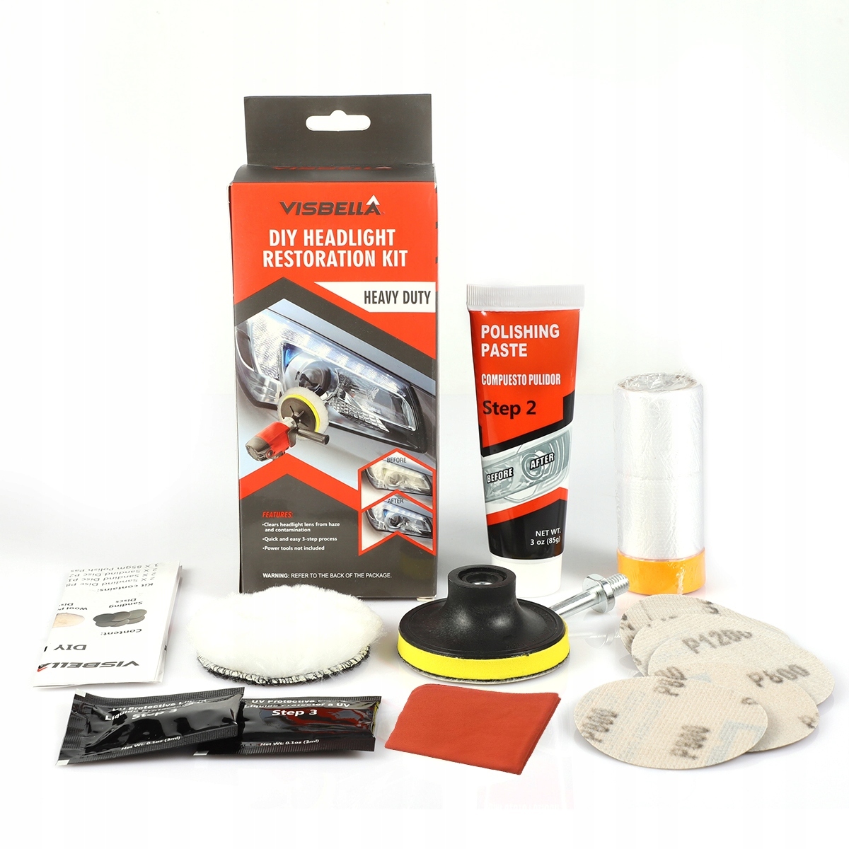 Набор содержит все, что необходимо для регенерации матовых фаров. Это позволяет вам получить очень хорошее влияние на большинство фаров и других предметов, сделанных из пластика, таких как: задние фонари, фар, лодочные окна, шлемы, передние мотоциклетные крышки, снегоходы и т. Д.
