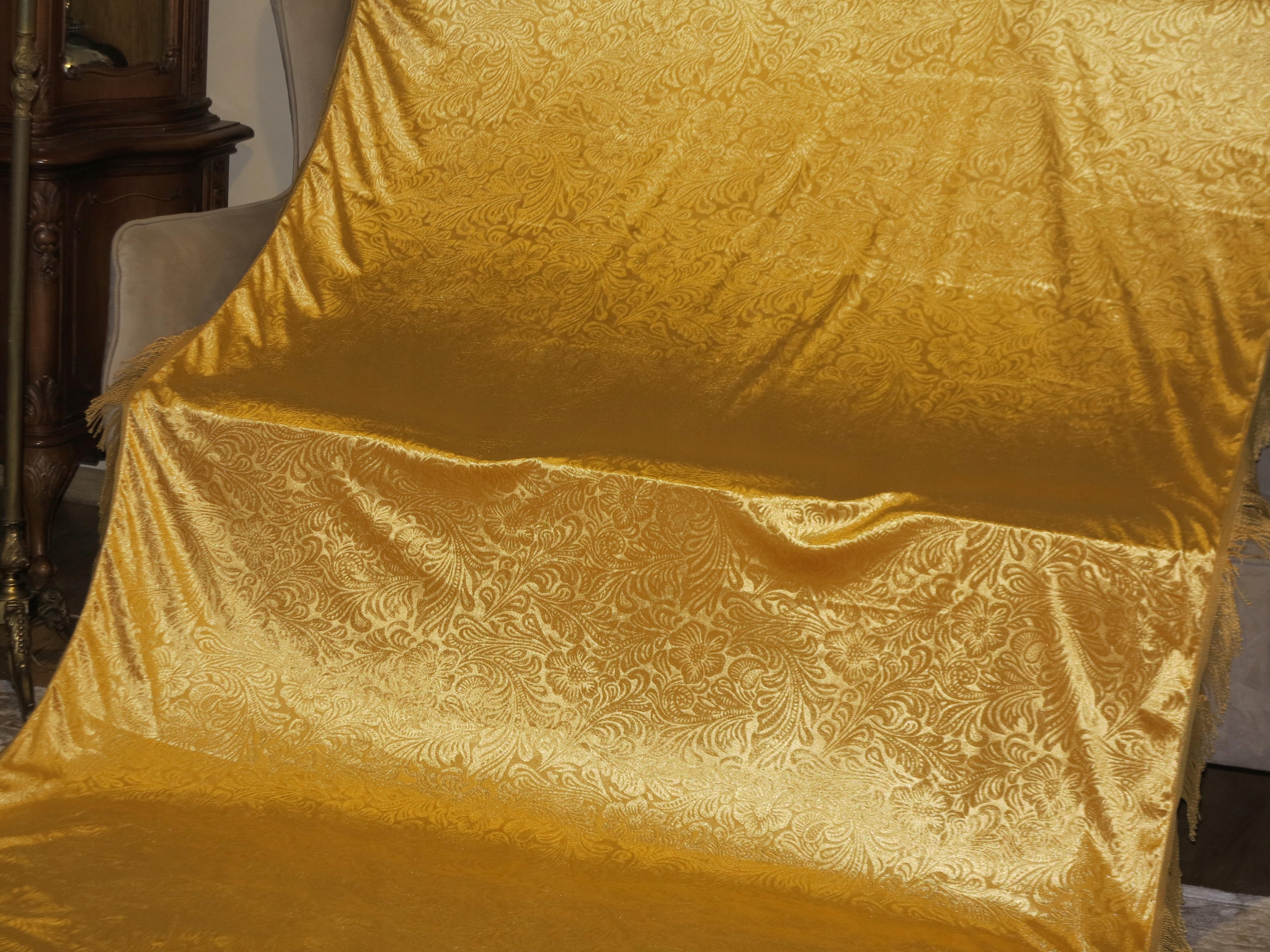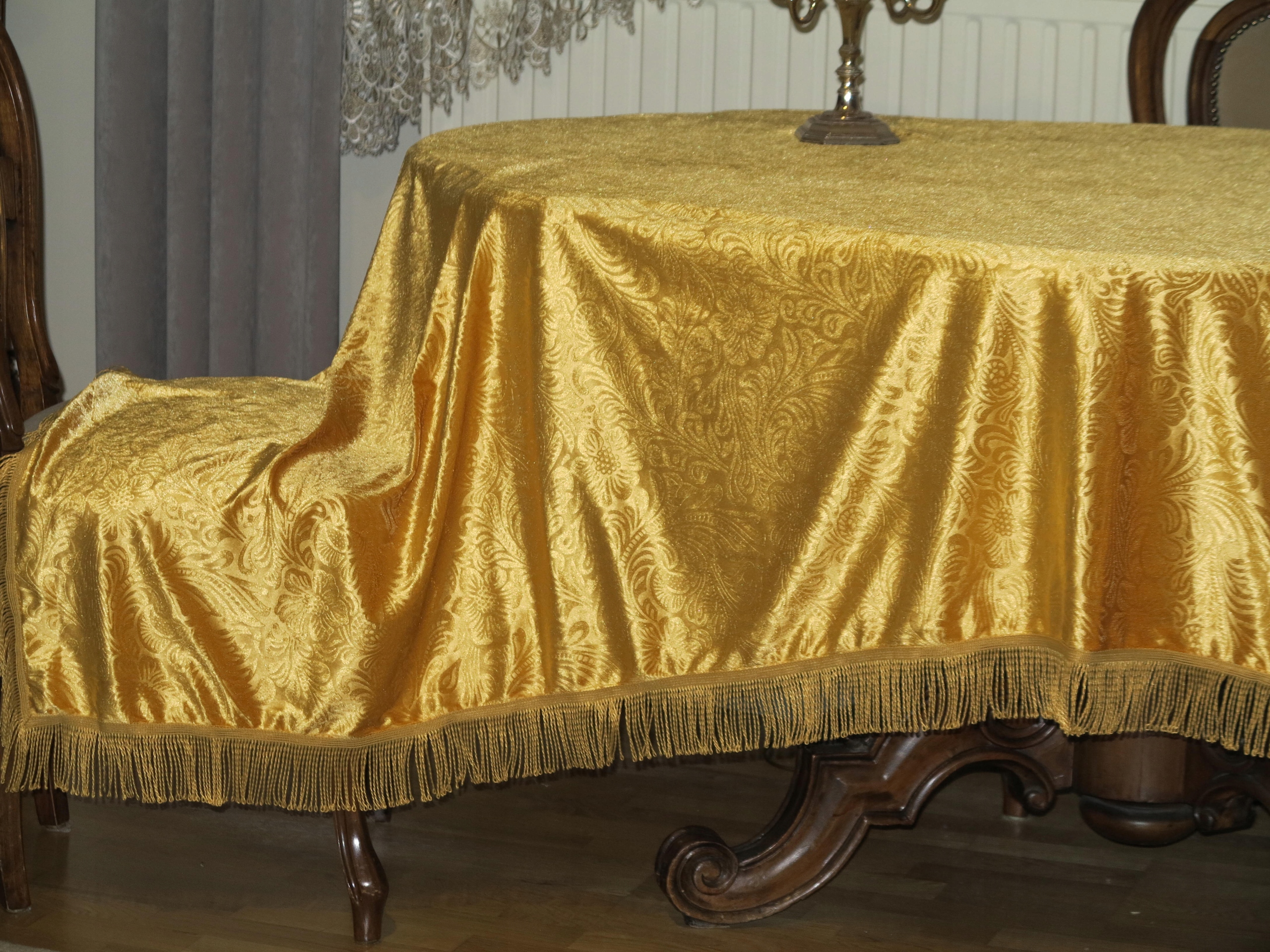 ОБРАЗЕЦ - ФЕНОМЕНОНАЛЬНО КРАСИВАЯ, ДВОРЕЦОВАЯ ОГРОМНАЯ СКАТЕРТЬ, ИЗ ПУШИСТОГО БАРХАТА СО СТИЛЬНЫМ ТЕМПОВЫМ УЗОРОМ, ЗОЛОТОГО ЦВЕТА, ДЛИННАЯ ЗОЛОТАЯ БАХРА ВОКРУГ