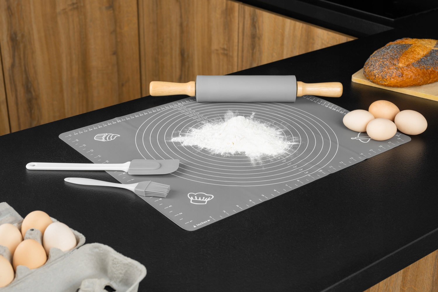 В комплект также входит функциональная скалка, которая не липкая, не впитывает жидкости и запахи. Дополнительно в наборе будет кисточка и силиконовая лопаточка, которая не царапает поверхность.