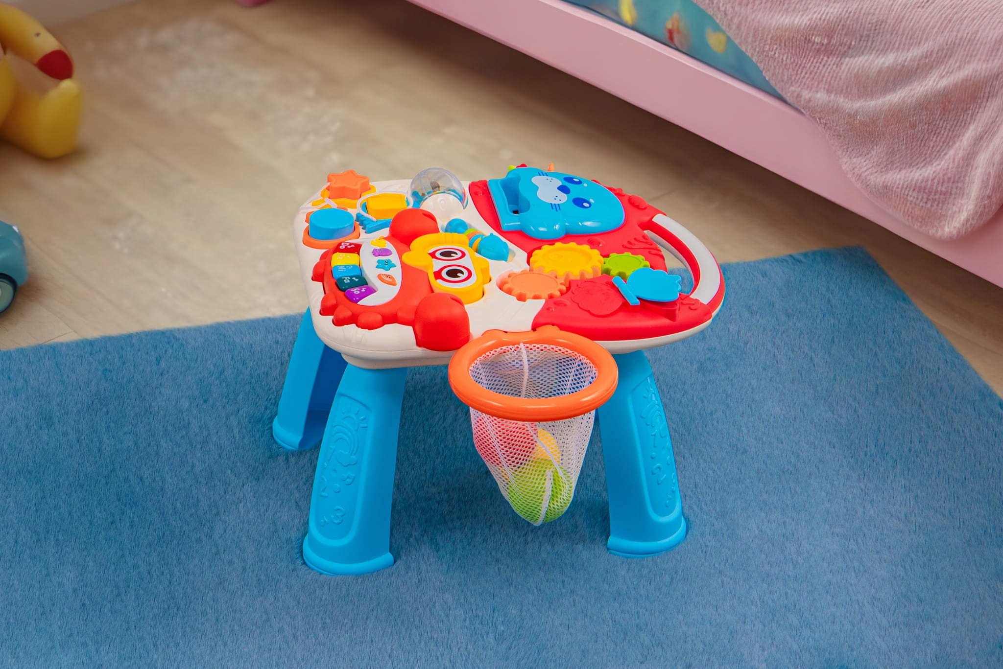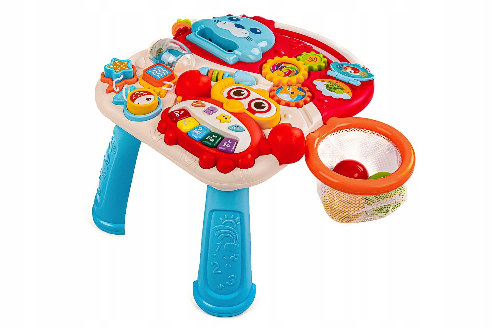 - На панели расположены: красочное пианино, три приводимые в движение шестеренки, сортер, корзинка для 3-х пластиковых шариков.