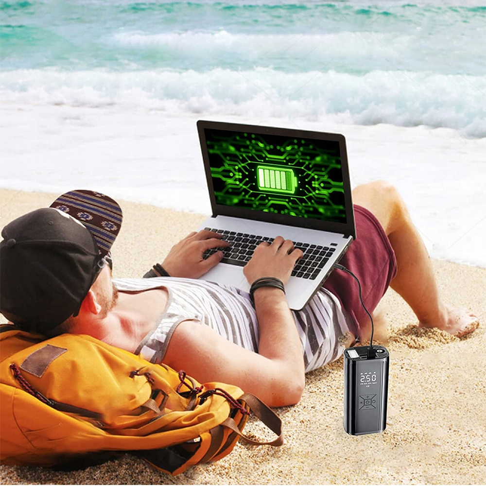 Портативный электрический воздушный насос и банк питания: этот электрический воздушный насос имеет встроенную батарею в 6000 мАч, это не только воздушный насос, но и мощный банк, вы можете подключить кабель зарядки для зарядки мобильного телефона и ноутбука, но и имеют интерфейс типа C и оборудованный кабель электроэнергии с автомобильным интерфейсом, который является удобным и быстрым для зарядки. Этот портативный электрический воздушный насос составляет всего 16 см / 8 см и может быть легко сохранен одной рукой.