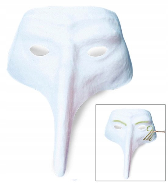 Маска пластиковая, с длинным носом. В маске вырезаются отверстия для глаз. Белый цвет. Матовый. Маска - идеальный аксессуар для карнавального бала. Его также можно использовать для костюма птицы. Вы также можете украсить его самостоятельно, например, раскрасить плакатными или акриловыми красками или использовать технику декупаж.