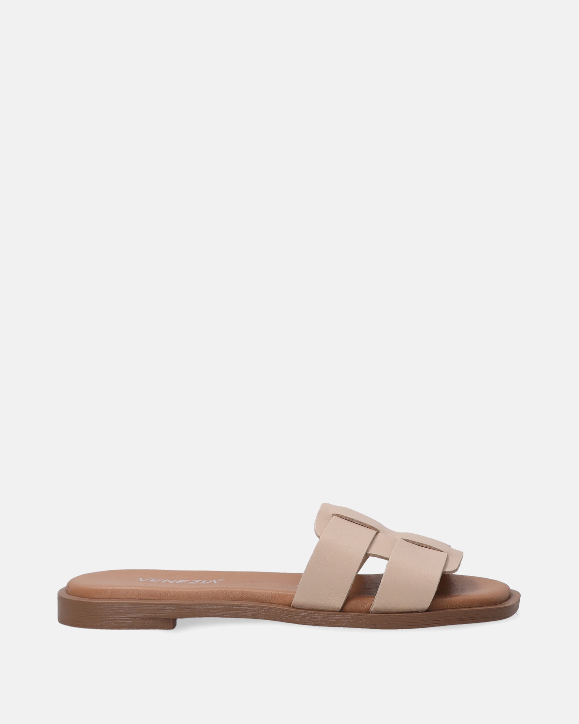 Женские тапочки, изготовленные из натуральной кожи бежевого цвета. Модель, установленная на плоской подошве, сочетает в себе комфорт с минималистским стилем. Широкий ремешок с впечатляющими интервалами тонко обнаруживает ногу, а геометрические квадратные носки подчеркивают современный характер целого. Приглушенный цвет делает его универсальным предложением на лето.
