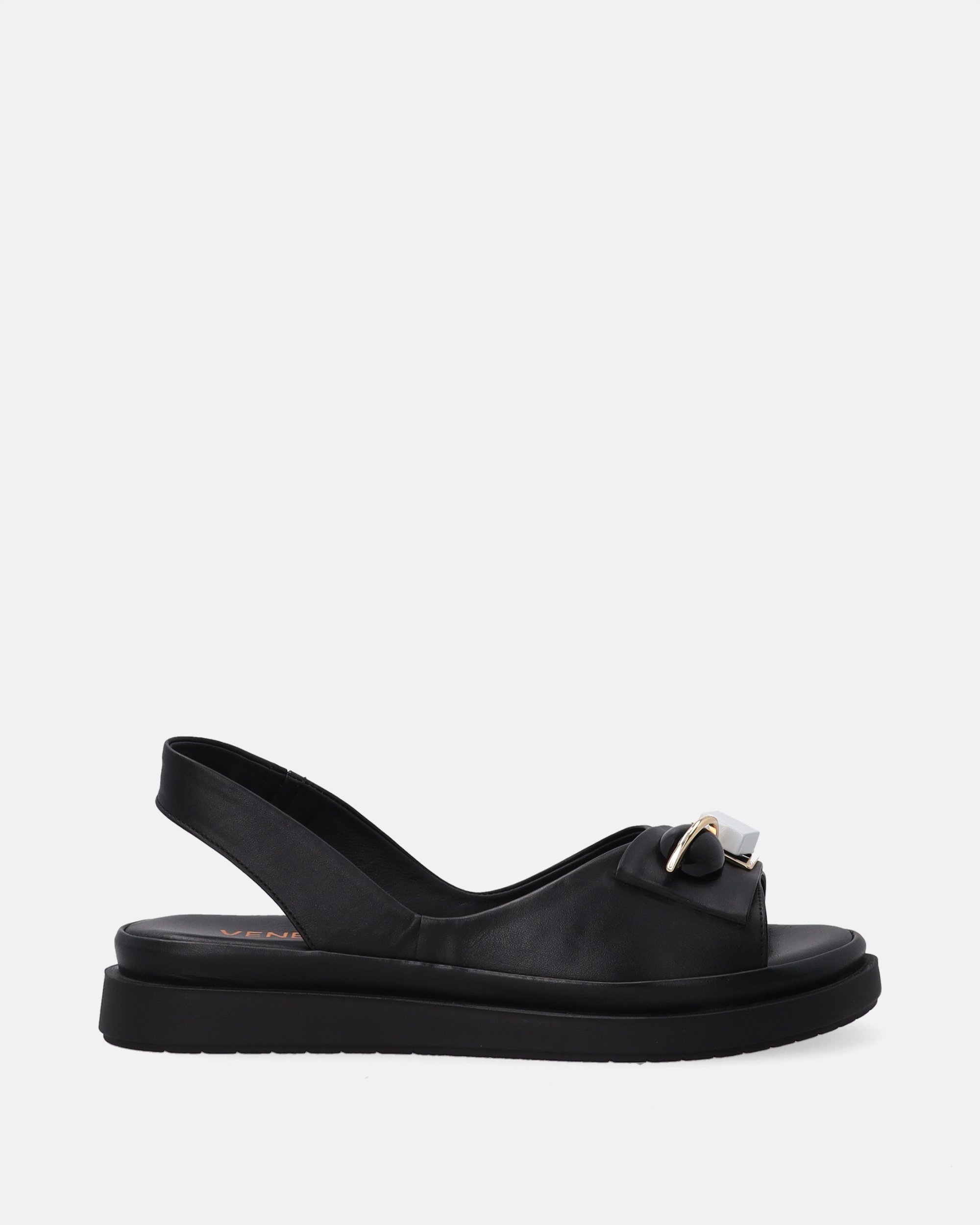 Черные сандалии из натуральной кожи с открытым носом и ремнем на пятке. Верхний с гладкой поверхностью, украшенный металлическими геометрическими элементами в белом и черном. Мягкая вставка и повышенная единственная гарантия комфорта в течение дня. Идеальная модель для лета.
