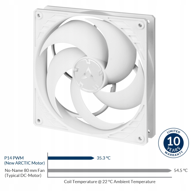 Понижение температуры двигателя на 10 °C примерно удваивает срок службы вентилятора. Новый двигатель ARCTIC имеет срок службы в четыре раза дольше благодаря низкой температуре катушки. В результате мы продлили гарантию до 10 лет.