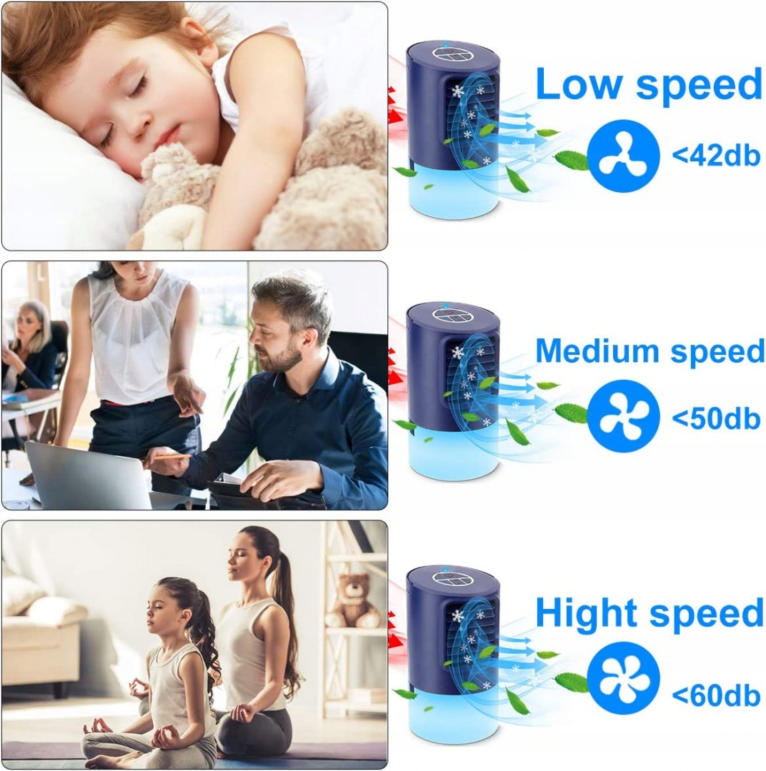 Наш небольшой кондиционер представляет собой комбинацию вентилятора, увлажнителя и кондиционера и оснащен воздухоохладителем, увлажнителем и светодиодной подсветкой. Вы можете использовать его только как вентилятор (3 скорости) или добавить лед/воду/эфирные масла, чтобы превратить его в мини-кондиционер, генерирующий влажный, свежий и холодный воздух. Не забудьте сначала добавить воды!