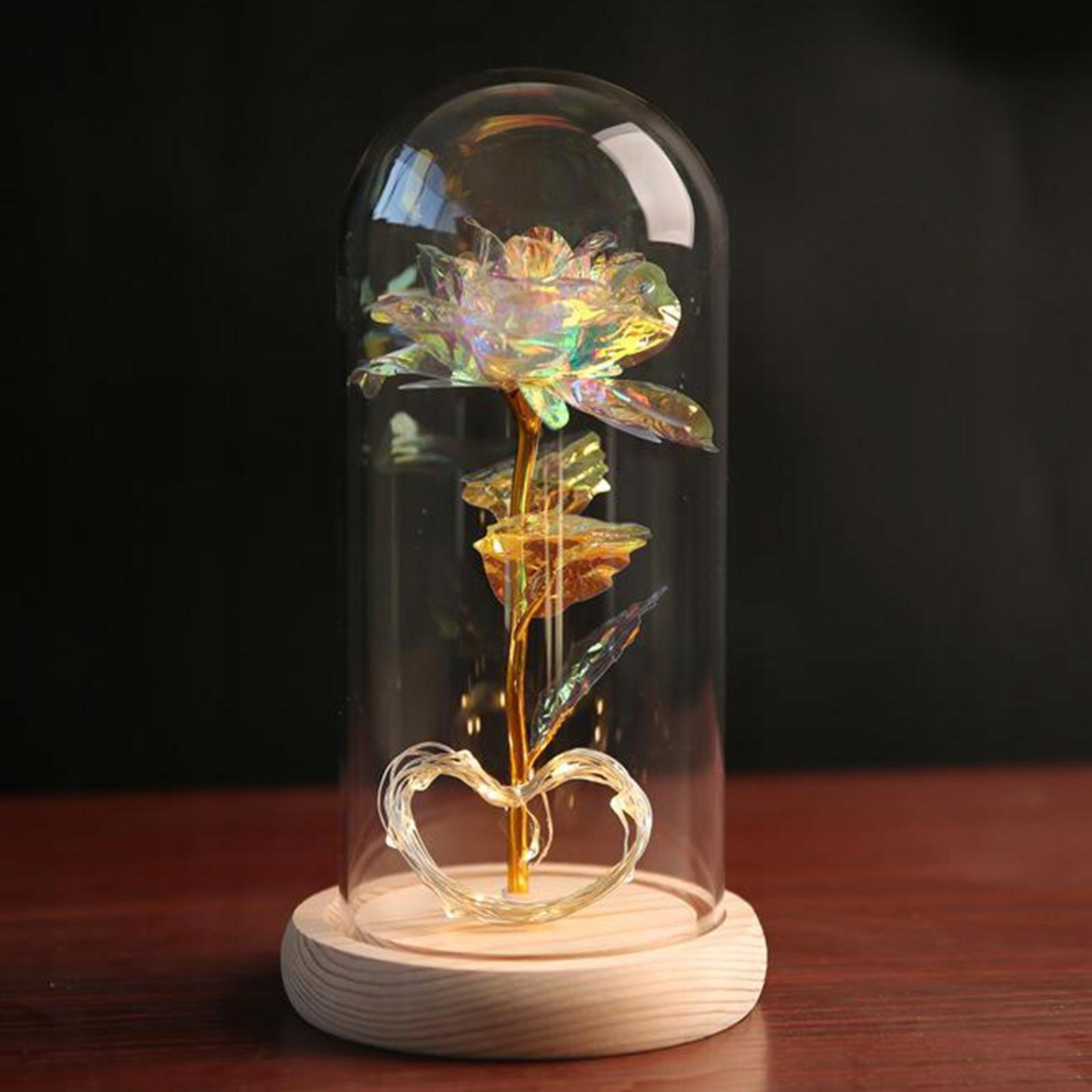 Цветок никогда не исчезает и не умирает, купол изготовлен из высококачественного боросерального стекла, прозрачного и долговечного, основание сделано из дерева, поверхность стабильная и гладкая без заусенцев
