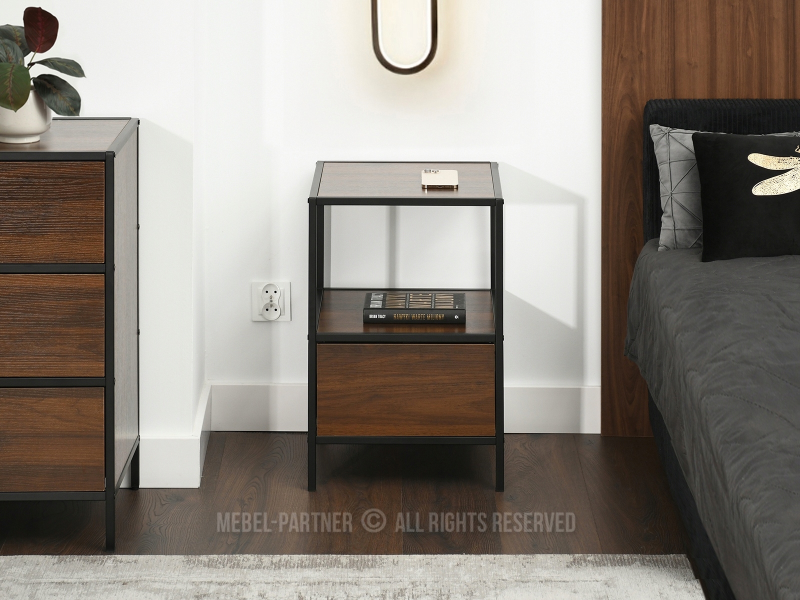 Самоа -прикроватная таблица с сенсорным ящиком является универсальным и практическим дополнением к любому интерьеру. Идеально подходит для кровати в спальне и в качестве вспомогательного стола в гостиной. Оснащенный системой открытия, обеспечивая удобство использования, и его промышленного стиля, борющегося с блэк-металлом и древесиной в оттенке ореховых гив. Пространство современного характера. Идеально подходит для хранения книг, пилотных или маленьких вещей, в то же время введение порядка и порядка. Размер - отлично подходит для небольших пространств