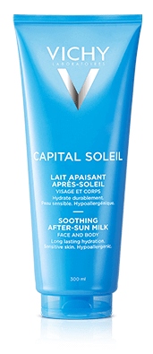 VICHY CAPITAL SOLEIL Увлажняющий лосьон после загара для лица и тела — препарат, разработанный специально для ухода за кожей после воздействия солнечных лучей. солнце. Эффективно предотвращает симптомы обезвоживания кожи, вызванные пребыванием на солнце. Благодаря соответствующему составу активных ингредиентов кожа становится мягкой и увлажненной. Липидная оболочка регенерируется, укрепляя защитный барьер кожи. Гиалуроновая кислота благодаря своим свойствам поддерживает должный уровень увлажнения кожи, тем самым улучшая ее упругость и эластичность. Молочко легкой, нежирной консистенции быстро впитывается.