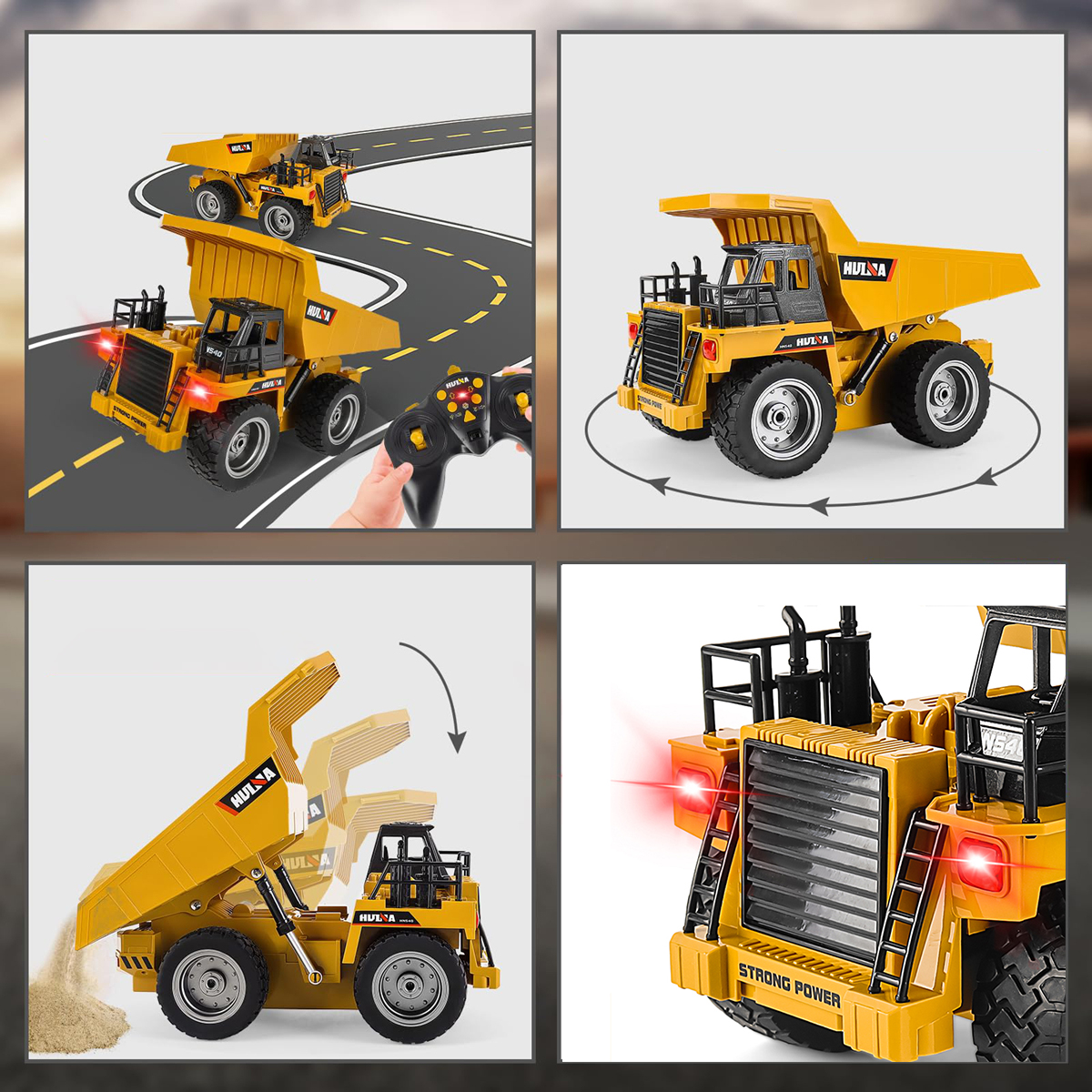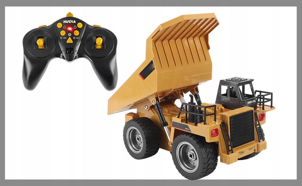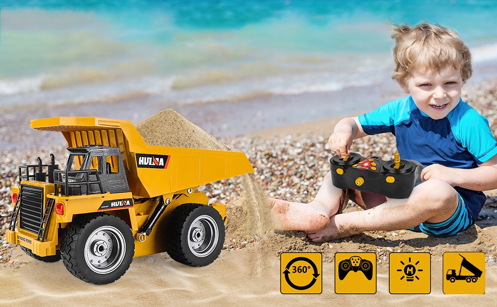 После загрузки песка, камней или почвы в большой контейнер вы можете быстро добраться до строительной площадки, перемещая твердый самосвал в масштабе 1:18, используя контроль.