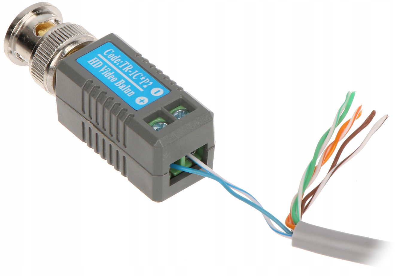 TR-1C*P2 предназначен для передачи видеосигнала по витой паре. Устройство подстраивает сопротивление коаксиального кабеля 75 Ом под сопротивление симметричного кабеля, обеспечивая передачу видеосигнала на расстояние до 400 м (витая пара 5-й категории) и устраняя асимметричные помехи. Обратите внимание на правильность подключения клемм (+) и (-). Обратное подключение приведет к искажению изображения.