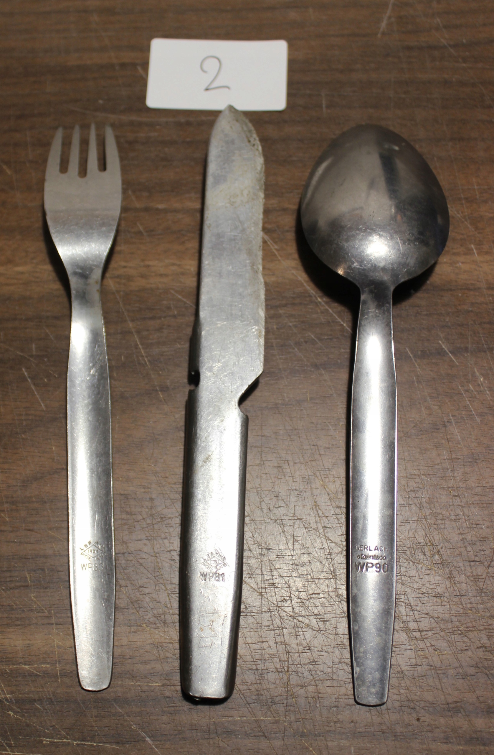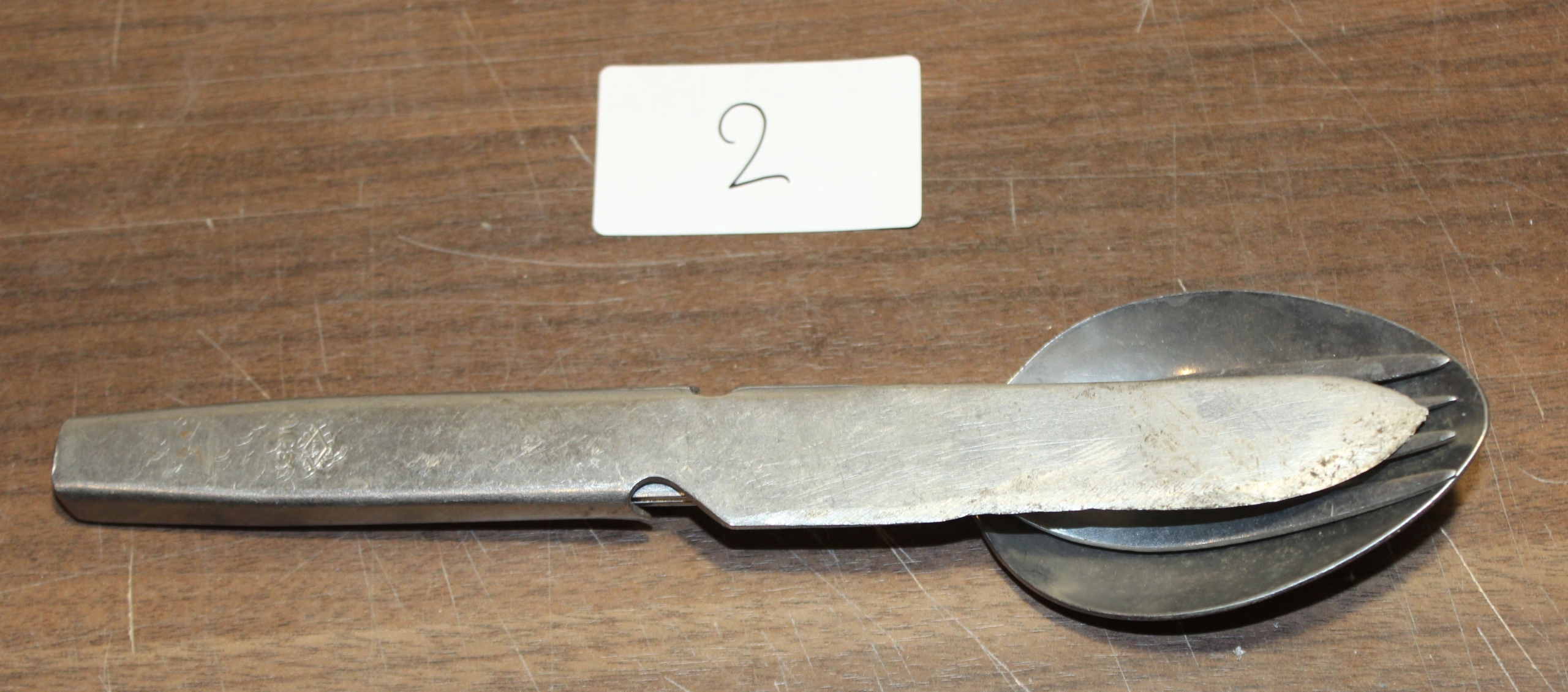В комплект входят вилка, ложка, нож. и открывашка для консервирования в одном. Нож устроен таким образом, что в него можно спрятать вилку и ложку.