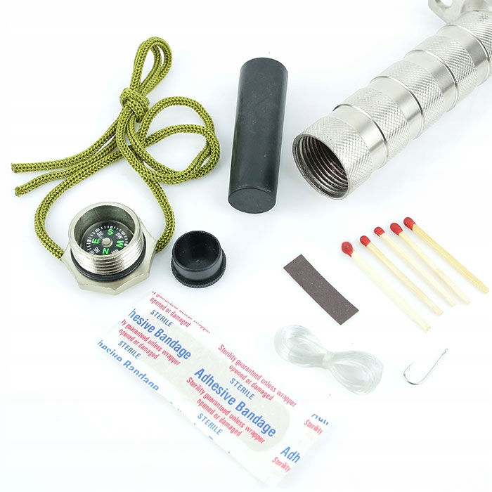 - Дополнительные элементы: отделение в ручке с: циркулем, спичками, палкой, пластырем, леской и крючком