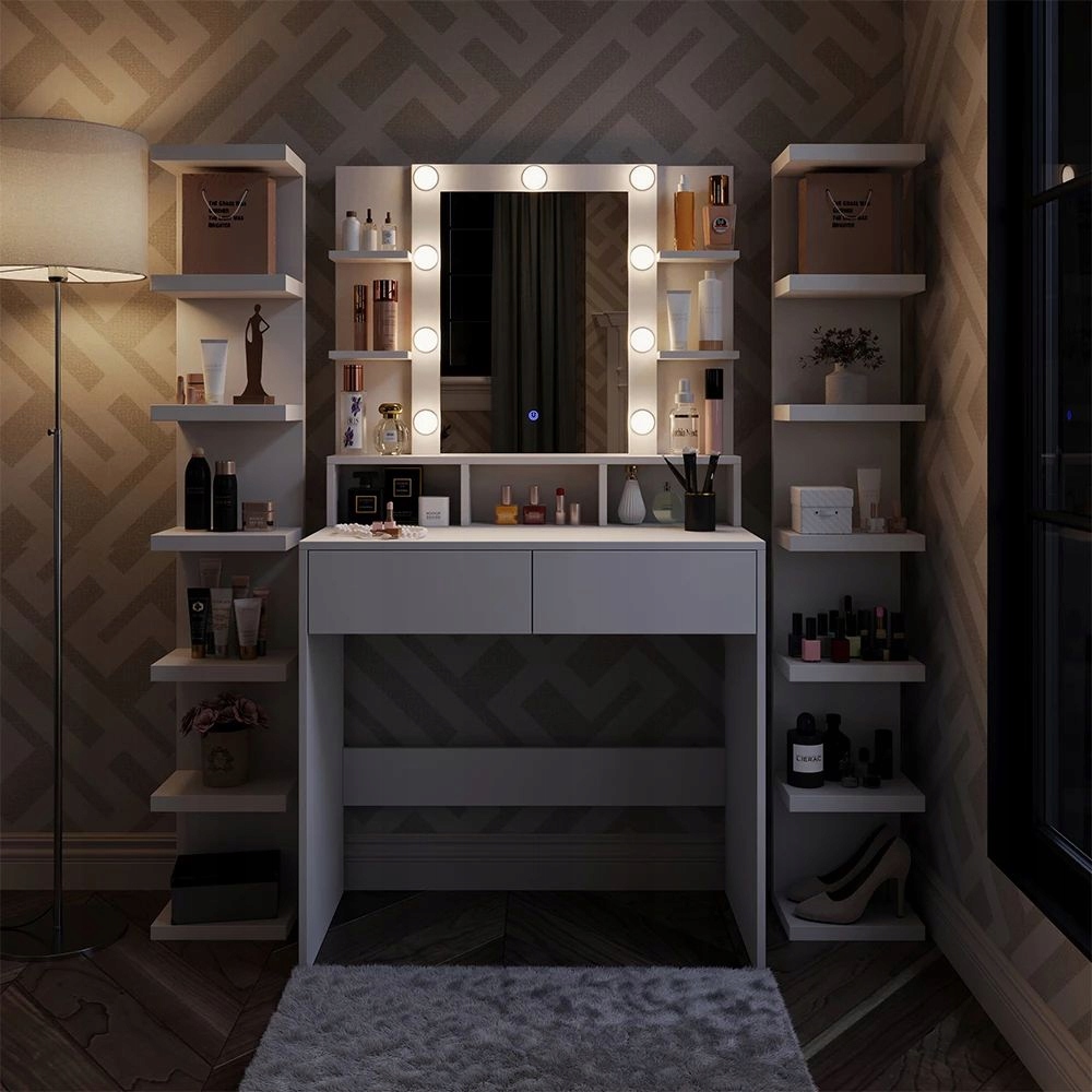 - Косметический стол с зеркалом предлагает 2 выдвижных ящика и светодиодное зеркальное освещение, обеспечивающее много места для хранения косметики.